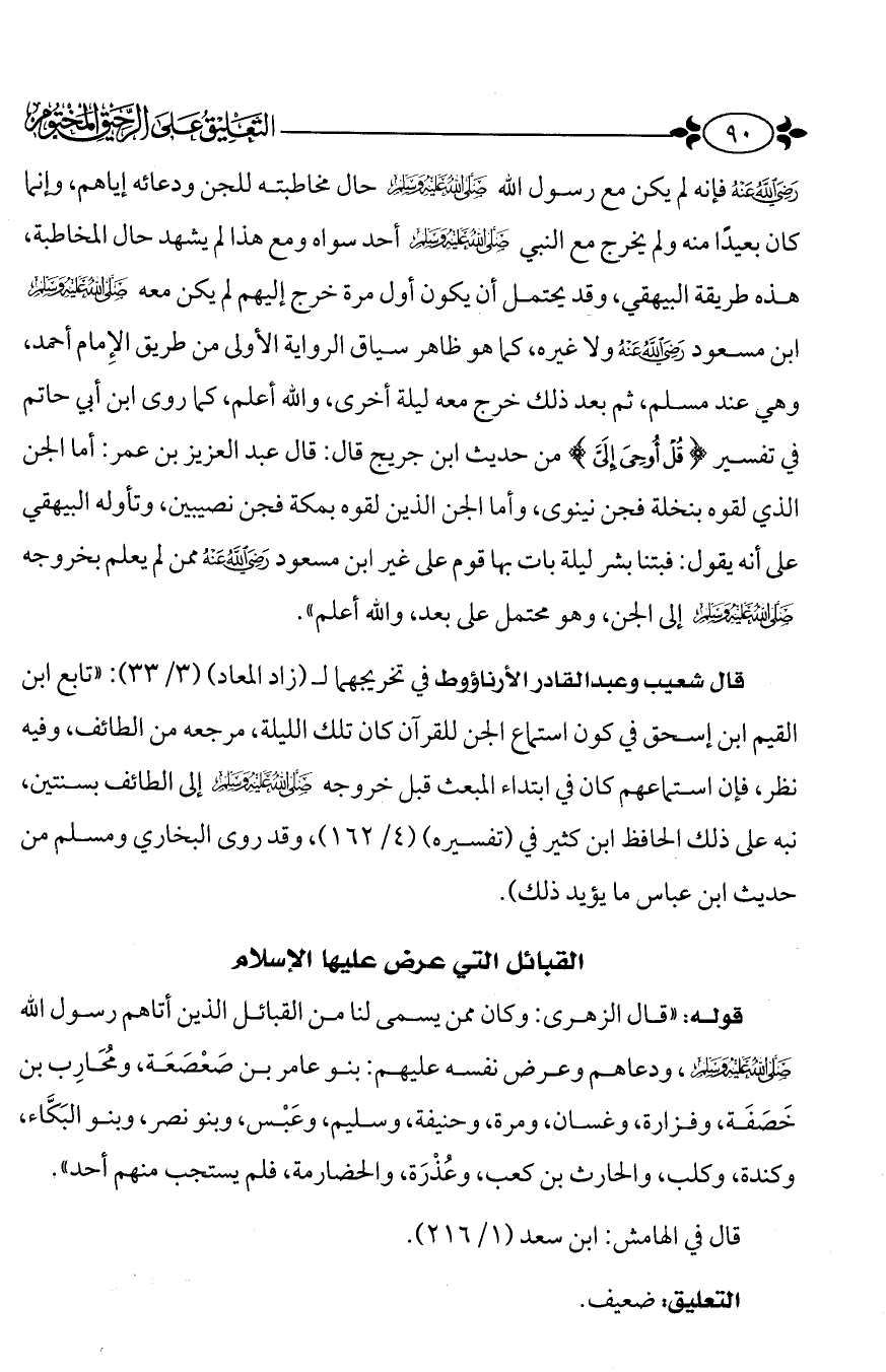 - رضي الله عنه - فإنه لم يكن مع رسول الله - صَلَّى اللَّهُ عَلَيْهِ وَسَلَّمَ - حال مخاطبته للجن ودعائه إياهم، وإنما كان بعيداً منه ولم يخرج مع النبي - صَلَّى اللَّهُ عَلَيْهِ وَسَلَّمَ - أحد سواه ومع هذا لم يشهد حال المخاطبة، هذه طريقة البيهقي، وقد يحتمل أن يكون أول مرة خرج إليهم لم يكن معه - صَلَّى اللَّهُ عَلَيْهِ وَسَلَّمَ - ابن مسعود - رضي الله عنه - ولا غيره، كما هو ظاهر سياق الرواية الأولى من طريق الإِمام أحمد، وهي عند مسلم، ثم بعد ذلك خرج معه ليلة أخرى، والله أعلم، كما روى ابن أبي حاتم في تفسير {قل أوحي إِلي} من حديث ابن جريج قال: قال عبد العزيز بن عمر: أما الجن الذي لقوه بنخلة فجن نينوى، وأما الجن الذين لقوه بمكة فجن نصيبين، وتأوله البيهقي على أنه يقول: فبتنا بشر ليلة بات بها قوم على غير ابن مسعود - رضي الله عنه - ممن لم يعلم بخروجه - صَلَّى اللَّهُ عَلَيْهِ وَسَلَّمَ - إلى الجن، وهو محتمل على بعد، والله أعلم).
