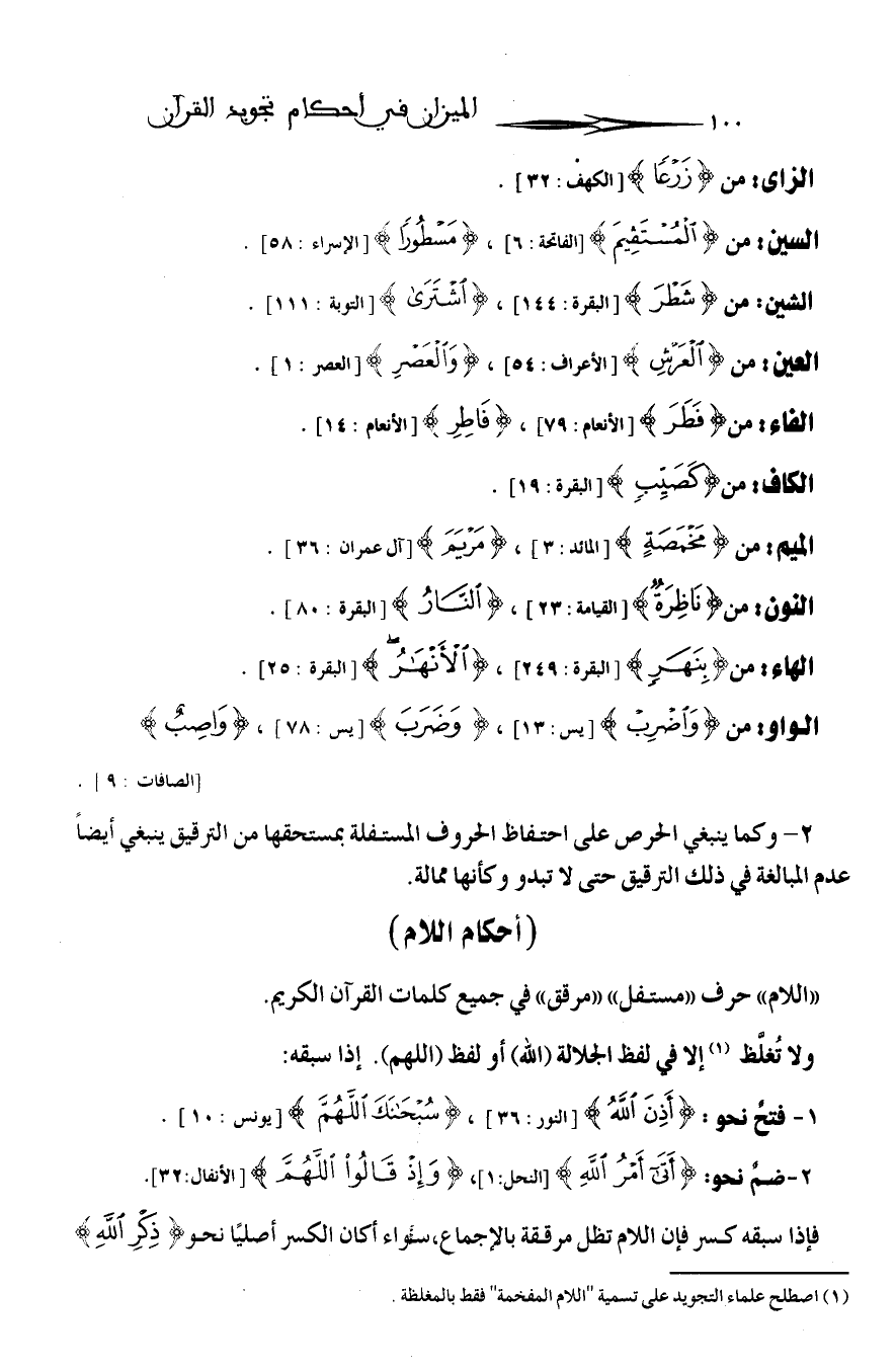 وقال أيضا في حاشيته على رسالته: «ولعل الحق أن الواو المدية تفخم بعد الحرف المفخم. وذلك لأن ترقيقها بعد المفخم في نحو (الطور) و (الصور) و (قوا) لا يمكن إلا بإشرابها صوت الياء المدية بأن يحرك وسط اللسان إلى جهة الحنك، كما يشهد به الوجدان الصادق، مع أن الواو ليس فيه عمل للسان أصلا.