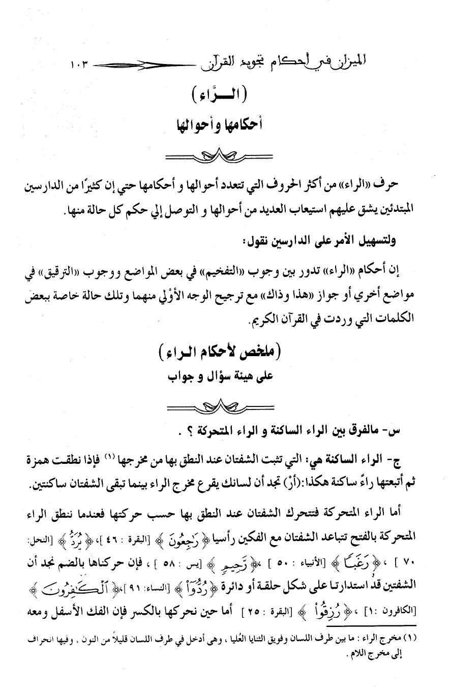 2 - إذا كانت الراء «ساكنة» وقبلها مفتوح نحو (المرجان- العرض- مريم- مرقدنا) فتكتسب الراء صفة الحرف المفتوح قبلها (أى صفة الفتح) وتأخذ حكم الراء المفتوحة «فتفخم».