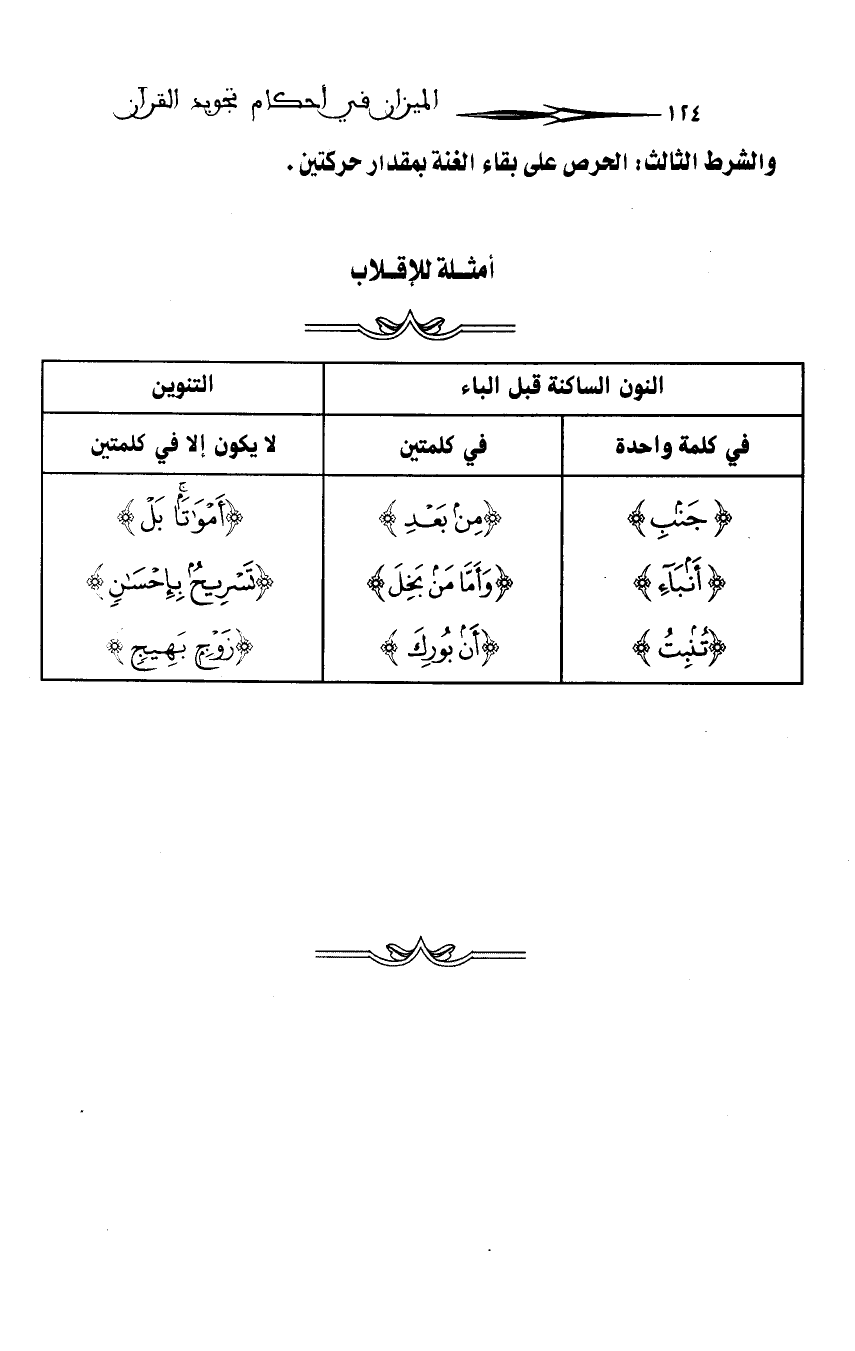 (1) إفادة: في حالة الإخفاء علي القارئ أن يحذر من إشباع الضمة التي قبل النون (وكذلك الفتحة والكسرة) لأن إشباع الضمة أو تمطيط زمنها يتولد منه واو في مثل (منقلبا) فتصير (مونقلبا)، وإشباع الكسرة يتولد منه ياء في مثل (إن شاء) فتصير (إين شاء)، وإشباع الفتحة يتولد منه ألف في مثل (من جاء) فتصير (مان جاء).