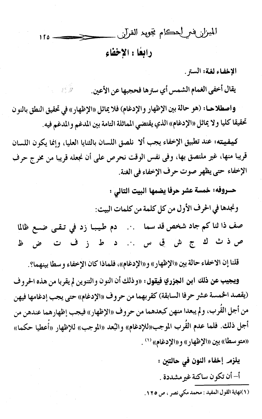 (3) إفادة: يكون الإخفاء أيضا في الحروف المقطعة بأوائل السور، والتي آخرها نون ساكنة، وبعدها أحد حروف الإخفاء كما في «عين سين قاف» فإن العين آخرها نون ساكنة، وبعدها أحد حروف الإخفاء وهو (السين) والسين آخرها أيضا نون ساكنة وبعدها أحد حروف الإخفاء وهو (القاف) فإننا نطبق الإخفاء في مثل هذا ونحوه (¬1).