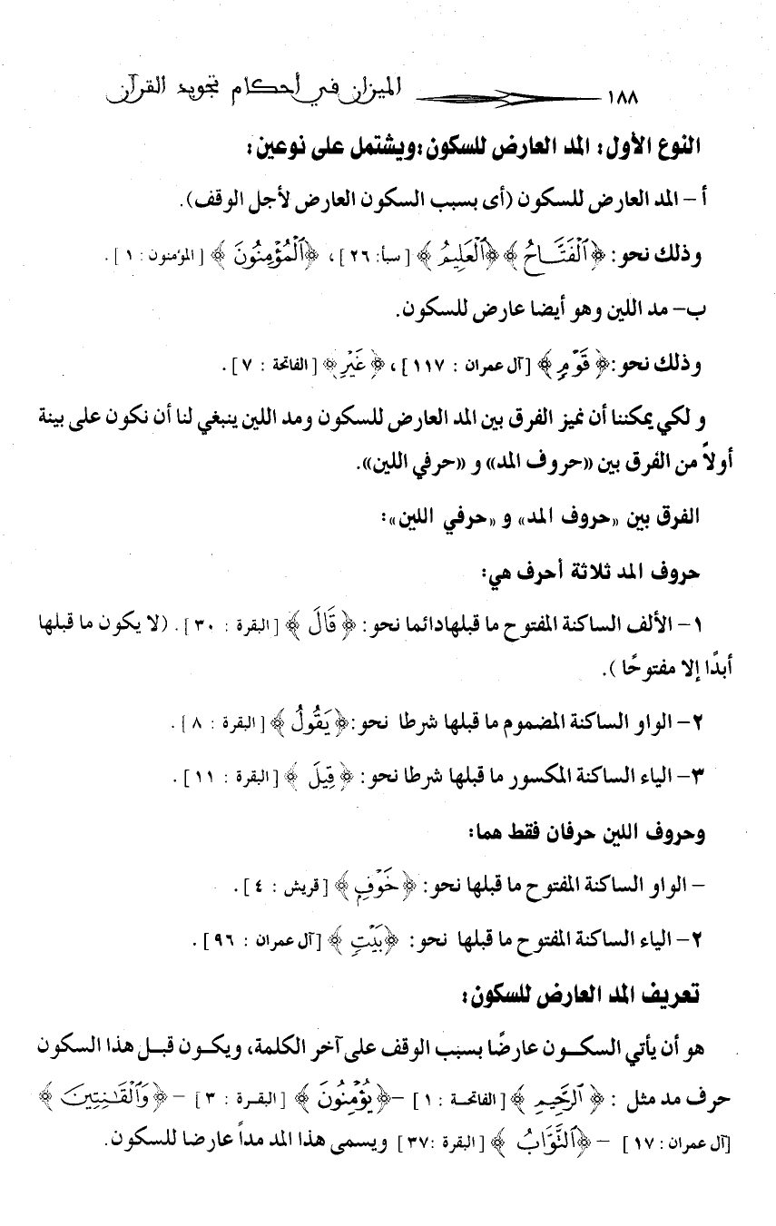 1 - المد اللازم 2 - المد المتصل 3 - المد العارض للسكون 4 - المد المنفصل 5 - مد البدل