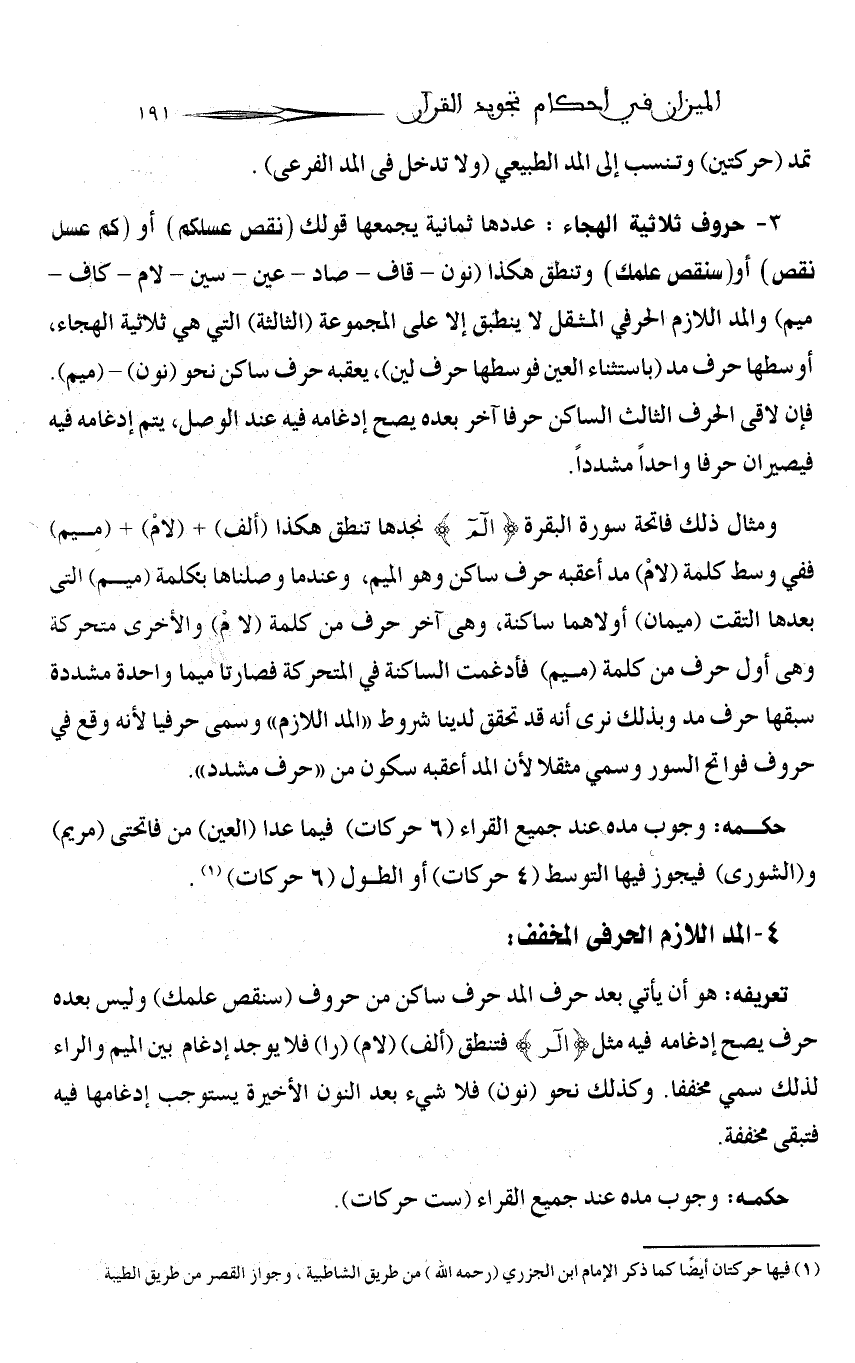 (حركتان)، والآخر السكون الذي أعقبها فصار مدا لازما (6 حركات) فنأخذ «باللازم» وهو الأقوى، ونهمل «البدل» وهو الأضعف.