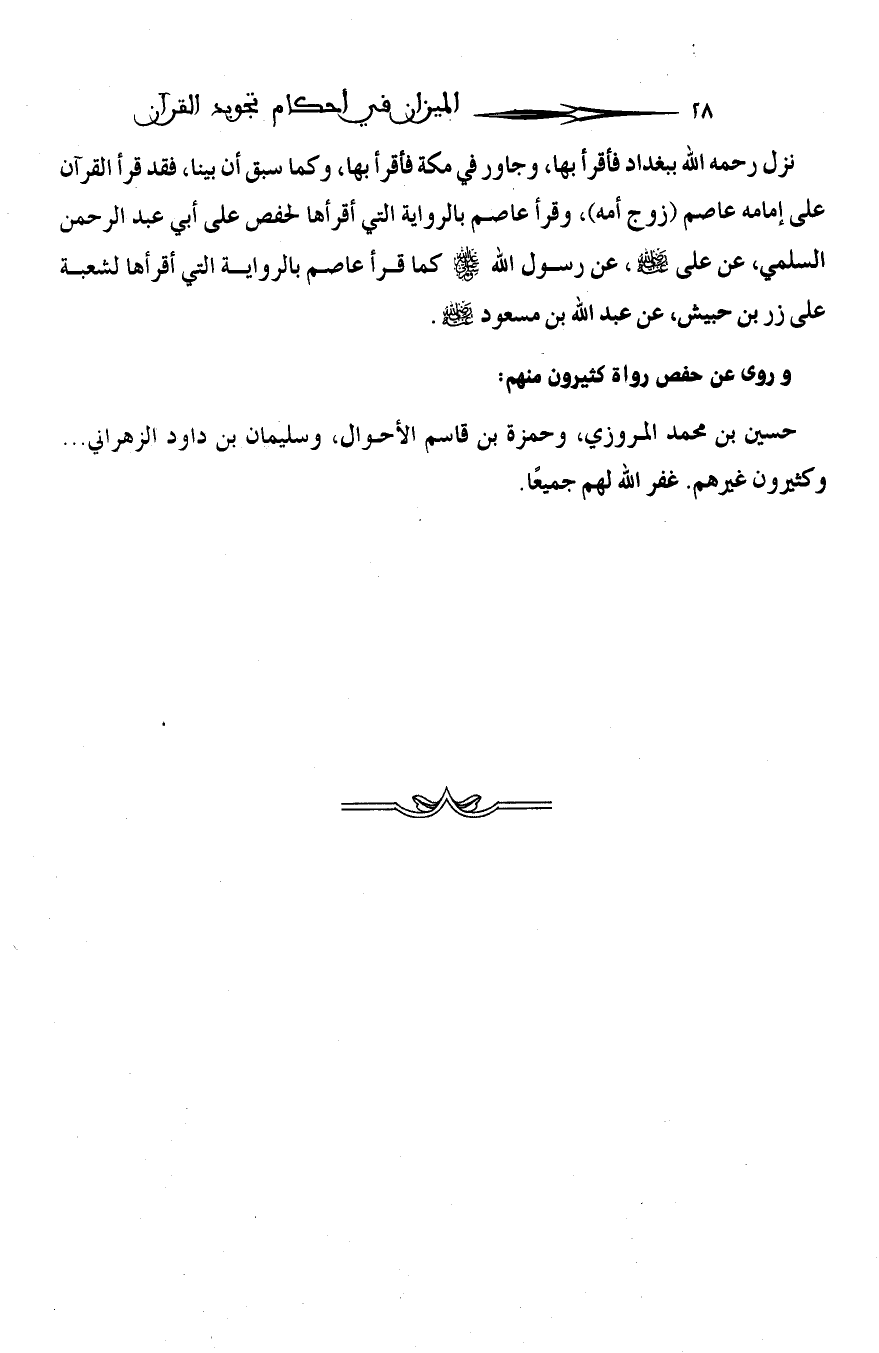................ «وحفص وبالإتقان كان مفضلا» نزل رحمه الله ببغداد فأقرأ بها، وجاور في مكة فأقرأ بها، وكما سبق أن بينا، فقد قرأ القرآن علي إمامه عاصم (زوج أمه)، وقرأ عاصم بالرواية التي أقرأها لحفص على أبي عبد الرحمن السلمي، عن علي رضي الله عنه، عن رسول الله صلى الله عليه وسلم كما قرأ عاصم بالرواية التي أقرأها لشعبة علي زر بن حبيش، عن عبد الله بن مسعود رضي الله عنه.