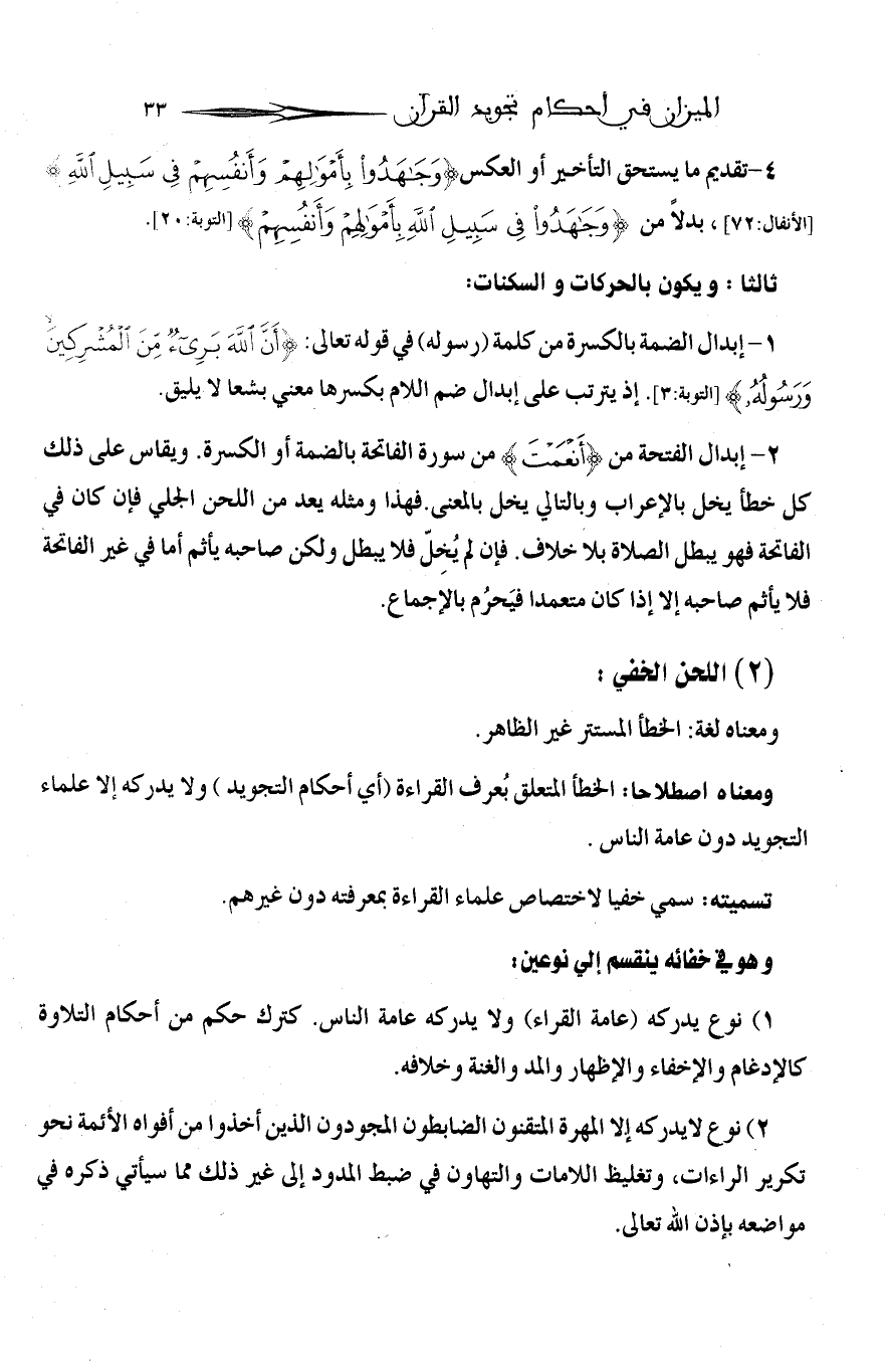 2) نوع لا يدركه إلا المهرة المتقنون الضابطون المجودون الذين أخذوا من أفواه الأئمة نحو تكرير الراءات، وتغليظ اللامات والتهاون في ضبط المدود إلى غير ذلك مما سيأتي ذكره في مواضعه بإذن الله تعالى. وهذا النوع من اللحن الخفي وإن كان غير مخل بالمعنى ولا مقصر باللفظ إلا أنه- كما يقول ابن الجزري (¬1):