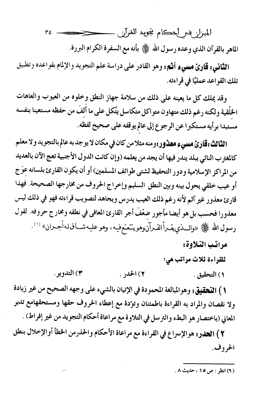 الثالث: قارئ مسيء معذور: ومنه مثلا من كان في مكان لا يوجد به عالم بالتجويد ولا معلم كالمغترب النائي ببلد يندر فيها أن يجد من يعلمه (وإن كانت الدول الأجنبية تعج الآن بالعديد من المراكز الإسلامية ودور التحفيظ لشتى طوائف المسلمين) أو أن يكون القارئ بلسانه عوج أو عيب خلقي يحول بينه وبين النطق السليم وإخراج الحروف من مخارجها الصحيحة. فهذا قارئ معذور غير آثم لأنه رغم ذلك العيب يدرس ويجاهد لتصويب قراءته فهو في ذلك ليس معذورا فحسب بل هو أيضا مأجور ضعف أجر القارئ المعافى في نطقه ومخارج حروفه. لقول رسول الله صلى الله عليه وسلم «والذي يقرأ القرآن وهو يتعتع فيه، وهو عليه شاق له أجران».