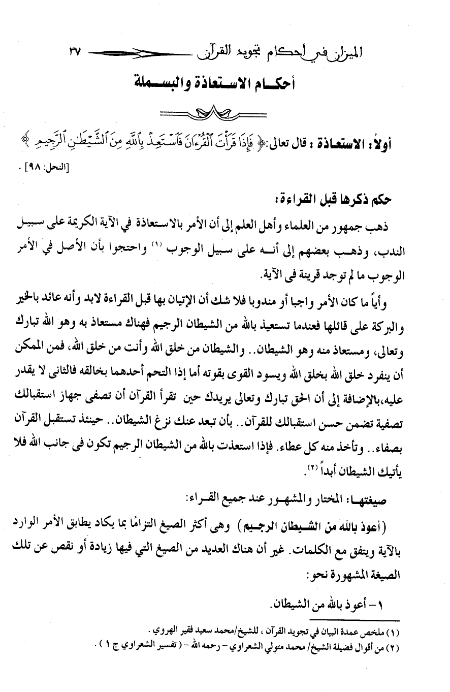 (أعوذ بالله من الشيطان الرجيم) وهى أكثر الصيغ التزاما بما يكاد يطابق