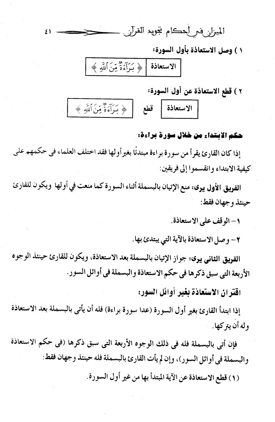إذا كان القارئ مبتدئا قراءته بأول سورة براءة (التوبة) فيحرم أن يأتى بالبسملة، وحينئذ عليه أن يأتى بالاستعاذة وأول السورة وله فى ذلك وجهان فقط: