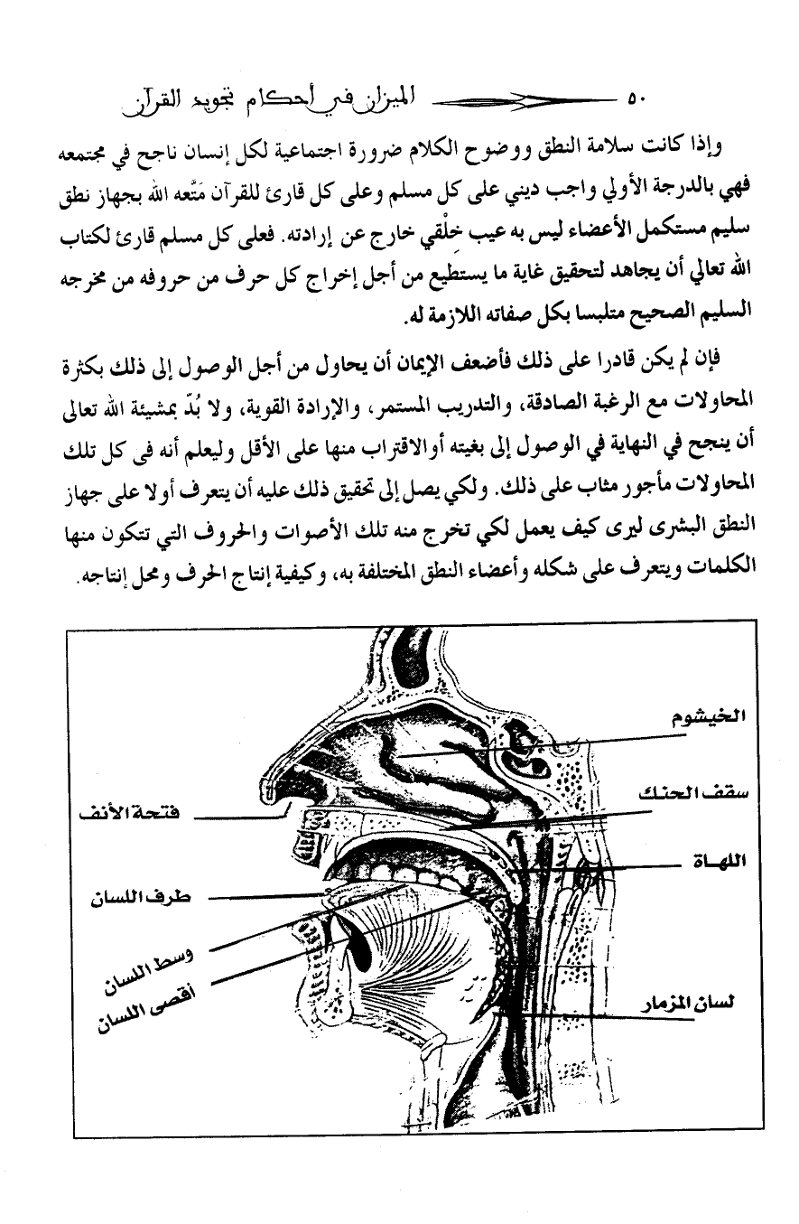 للقرآن متّعه الله بجهاز نطق سليم مستكمل الأعضاء ليس به عيب خلقي خارج عن إرادته. فعلي كل مسلم قارئ لكتاب الله تعالي أن يجاهد لتحقيق غاية ما يستطيع من أجل إخراج كل حرف من حروفه من مخرجه السليم الصحيح متلبسا بكل صفاته اللازمة له. فإن لم يكن قادرا على ذلك فأضعف الإيمان أن يحاول من أجل الوصول إلى ذلك بكثرة المحاولات مع الرغبة الصادقة، والتدريب المستمر، والإرادة القوية، ولا بدّ بمشيئة الله تعالى أن ينجح في النهاية في الوصول إلى بغيته أو الاقتراب منها على الأقل وليعلم أنه فى كل تلك المحاولات مأجور مثاب على ذلك. ولكي يصل إلى تحقيق ذلك عليه أن يتعرف أولا على جهاز النطق البشرى [تصوير]