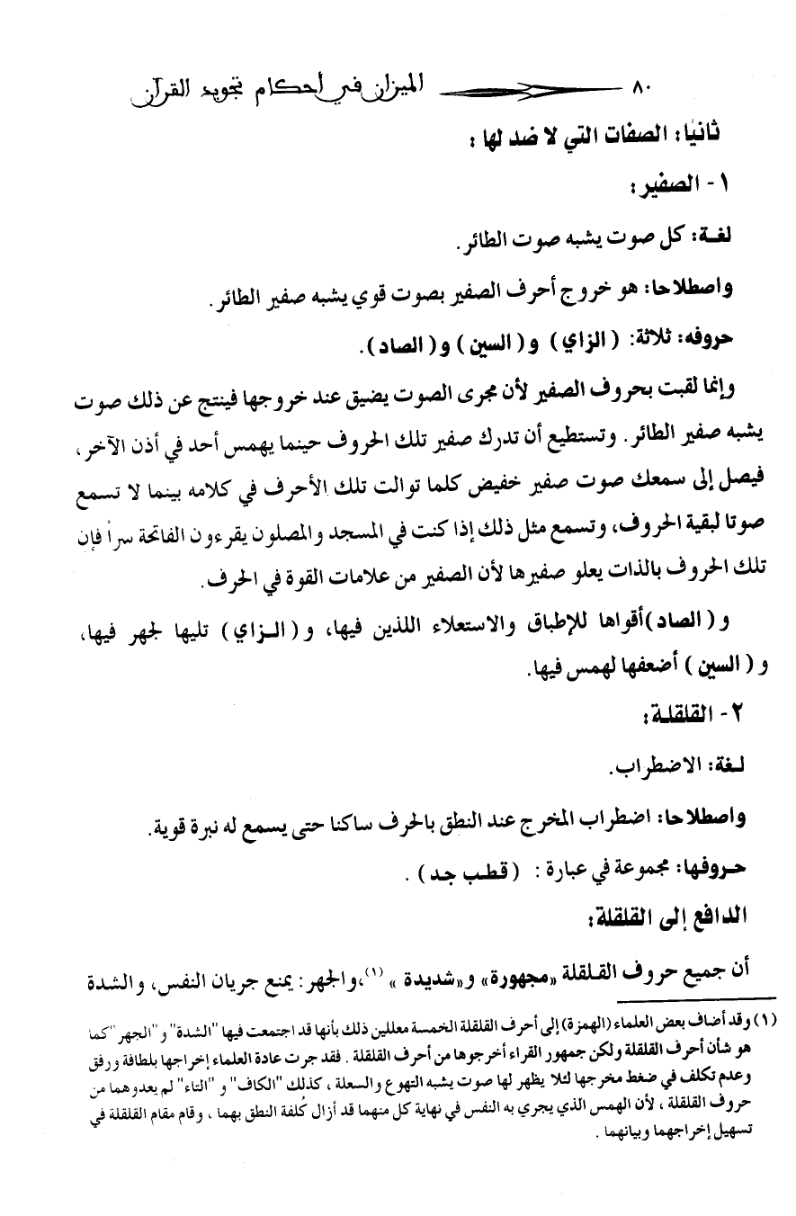 «قال المرعشى في تبصرة المريد»: وتنقسم القلقلة إلى ثلاثة أقسام: أعلى وهو في (الطاء). و (أوسط) وهو في (الجيم)، وأدنى وهو في الثلاث الباقية» (¬3). (يعنى بذلك: القاف، والباء، والدال).