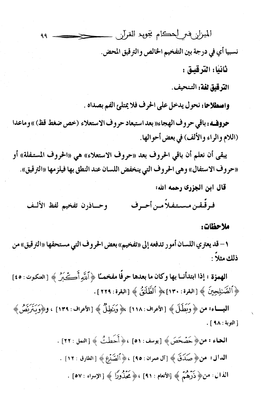بعض كتب التجويد. اقتصرت على حرف الألف فقط في اتباعه حالة الحرف الذي قبله ترقيقا وتفخيما. والبعض أضاف إلى الألف حرفا «الواو والياء» أيضا.