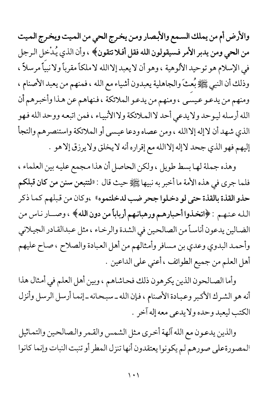 وَالْأَرْضِ أَمَّنْ يَمْلِكُ السَّمْعَ وَالْأَبْصَارَ وَمَنْ يُخْرِجُ الْحَيَّ مِنَ الْمَيِّتِ وَيُخْرِجُ الْمَيِّتَ مِنَ الْحَيِّ وَمَنْ يُدَبِّرُ الْأَمْرَ فَسَيَقُولُونَ اللَّهُ فَقُلْ أَفَلا تَتَّقُونَ} ، وأن الذي يدخل الرجل في الإسلام هو توحيد الألوهية، وهو أن لا يعبد إلا الله لا ملكاً مقرباً ولا نبيا مرسلاً، وذلك أن النبي صلى الله عليه وسلم بعث والجاهلية يعبدون أشياء مع الله، فمنهم من يعبد الأصنام، ومنهم من يدعو عيسى، ومنهم من يدعو الملائكة، فنهاهم عن هذا وأخبرهم أن الله أرسله ليوحد ولا يدعي أحد لا الملائكة ولا الأنبياء، فمن اتبعه ووحد الله فهو الذي شهد أن لا إله إلا الله، ومن عصاه ودعا عيسى أو الملائكة واستنصرهم والتجأ إليهم فهو الذي جحد لا إله إلا الله مع إقراره أنه لا يخلق ولا يرزق إلا هو.