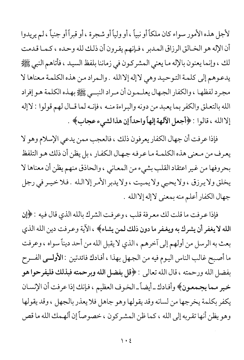 لأجل هذه الأمور سواء كان ملكاً أو نبيا، أو ولياً أو شجرة، أو قبراً أو جنياً، لم يريدوا أن الإله هو الخالق الرازق المدبر، فإنهم يقرون أن ذلك لله وحده، كما قدمت لك، وإنما يعنون بالإله ما يعني المشركون في زماننا بلفظ السيد، فأتاهم النبي صلى الله عليه وسلم يدعوهم إلى كلمة التوحيد وهي لا إله إلا الله. والمراد من هذه الكلمة معناها لا مجرد لفظها، والكفار الجهال يعلمون أن مراد النبي صلى الله عليه وسلم بهذه الكلمة هو إفراد الله بالتعلق والكفر بما يعبد من دونه والبراءة منه، فإنه لما قال لهم قولوا: لا إله إلا الله، قالوا: {أَجَعَلَ الْآلِهَةَ إِلَهاً وَاحِداً إِنَّ هَذَا لَشَيْءٌ عُجَابٌ} .