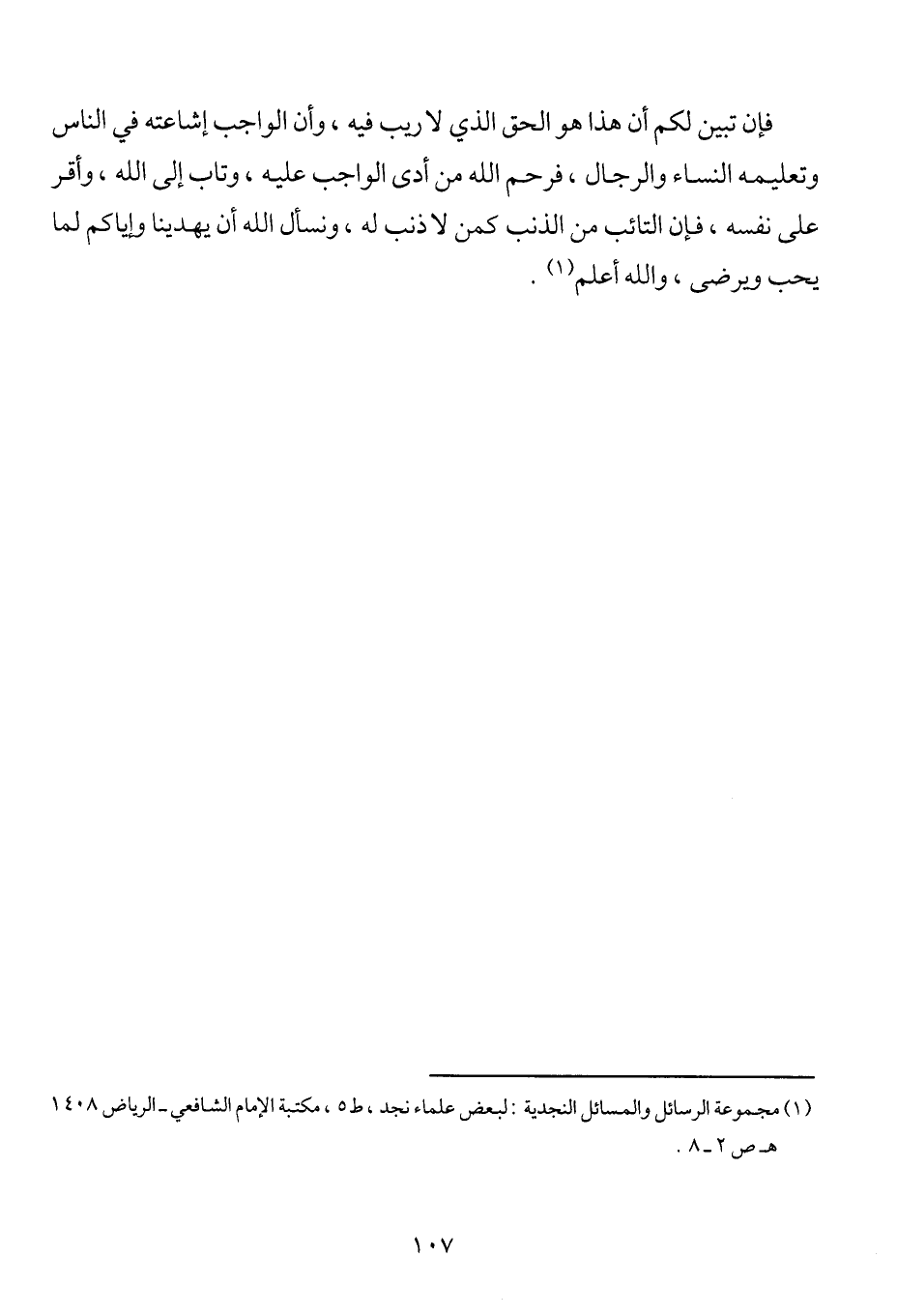 فإن تبين لكم أن هذا هو الحق الذي لا ريب فيه، وأن الواجب إشاعته في الناس وتعليمه النساء والرجال، فرحم الله من أدى الواجب عليه، وتاب إلى الله، وأقر على نفسه، فإن التائب من الذنب كمن لا ذنب له، ونسأل الله أن يهدينا وإياكم لما يحب ويرضى، والله اعلم1.