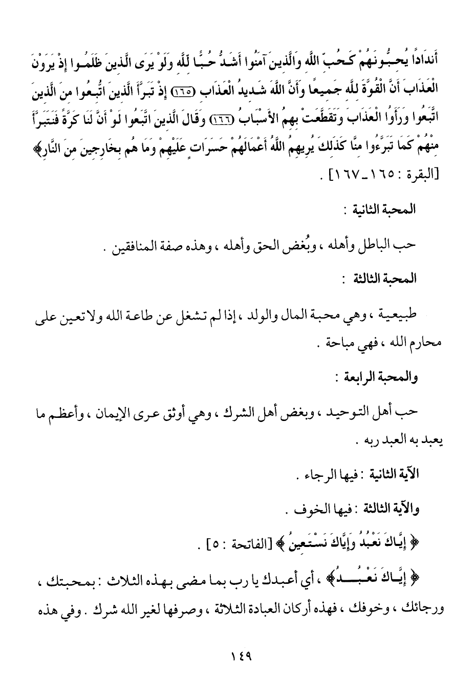 أَنْدَاداً يُحِبُّونَهُمْ كَحُبِّ اللَّهِ وَالَّذِينَ آمَنُوا أَشَدُّ حُبّاً لِلَّهِ وَلَوْ يَرَى الَّذِينَ ظَلَمُوا إِذْ يَرَوْنَ الْعَذَابَ أَنَّ الْقُوَّةَ لِلَّهِ جَمِيعاً وَأَنَّ اللَّهَ شَدِيدُ الْعَذَابِ. إِذْ تَبَرَّأَ الَّذِينَ اتُّبِعُوا مِنَ الَّذِينَ اتَّبَعُوا وَرَأَوُا الْعَذَابَ وَتَقَطَّعَتْ بِهِمُ الْأَسْبَابُ. وَقَالَ الَّذِينَ اتَّبَعُوا لَوْ أَنَّ لَنَا كَرَّةً فَنَتَبَرَّأَ مِنْهُمْ كَمَا تَبَرَّأُوا مِنَّا كَذَلِكَ يُرِيهِمُ اللَّهُ أَعْمَالَهُمْ حَسَرَاتٍ عَلَيْهِمْ وَمَا هُمْ بِخَارِجِينَ مِنَ النَّارِ} (البقرة: 165-167) .