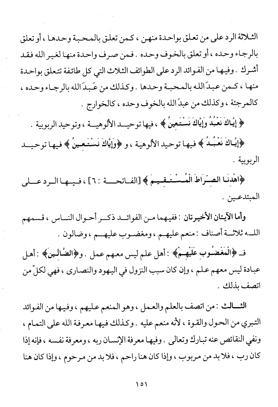 الثالث: من اتصف بالعلم والعمل، وهو المنعم عليهم، وفيها من الفوائد التبري من الحول والقوة، لأنه منعم عليه. وكذلك فيها معرفة الله على التمام، ونفي النقائص عنه تبارك وتعالى، وفيها معرفة الإنسان ربه، ومعرفة نفسه، فإنه إذا كان رب، فلا بد من مربوب، وإذا كان هنا راحم، فلا بد من مرحوم، وإذا كان هنا