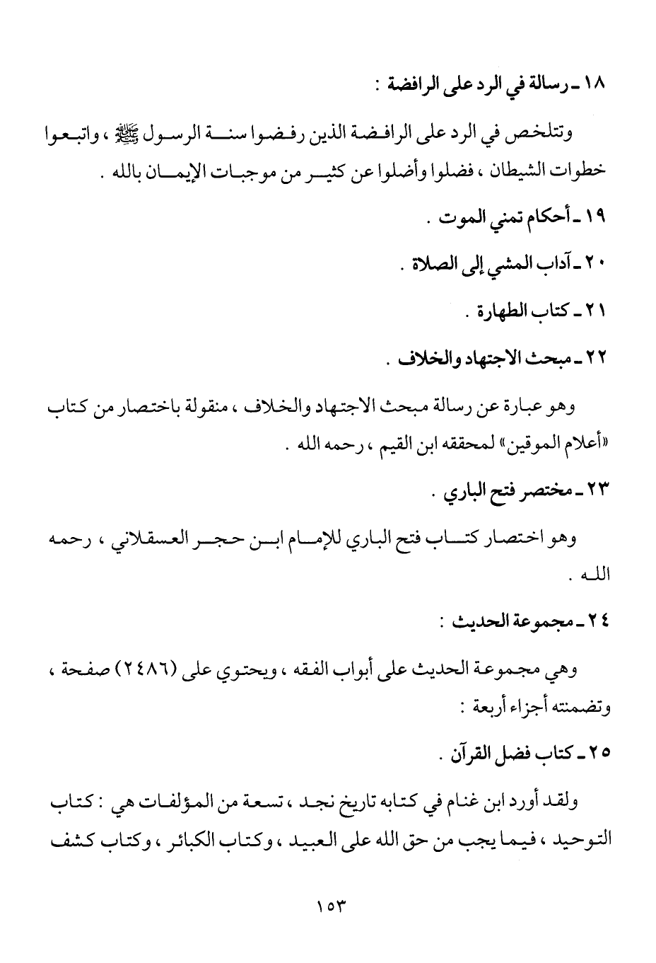ولقد أورد ابن غنام في كتابه تاريخ نجد، تسعة من المؤلفات هي: كتاب التوحيد فيما يجب من حق الله على العبيد، وكتاب الكبائر، وكتاب كشف