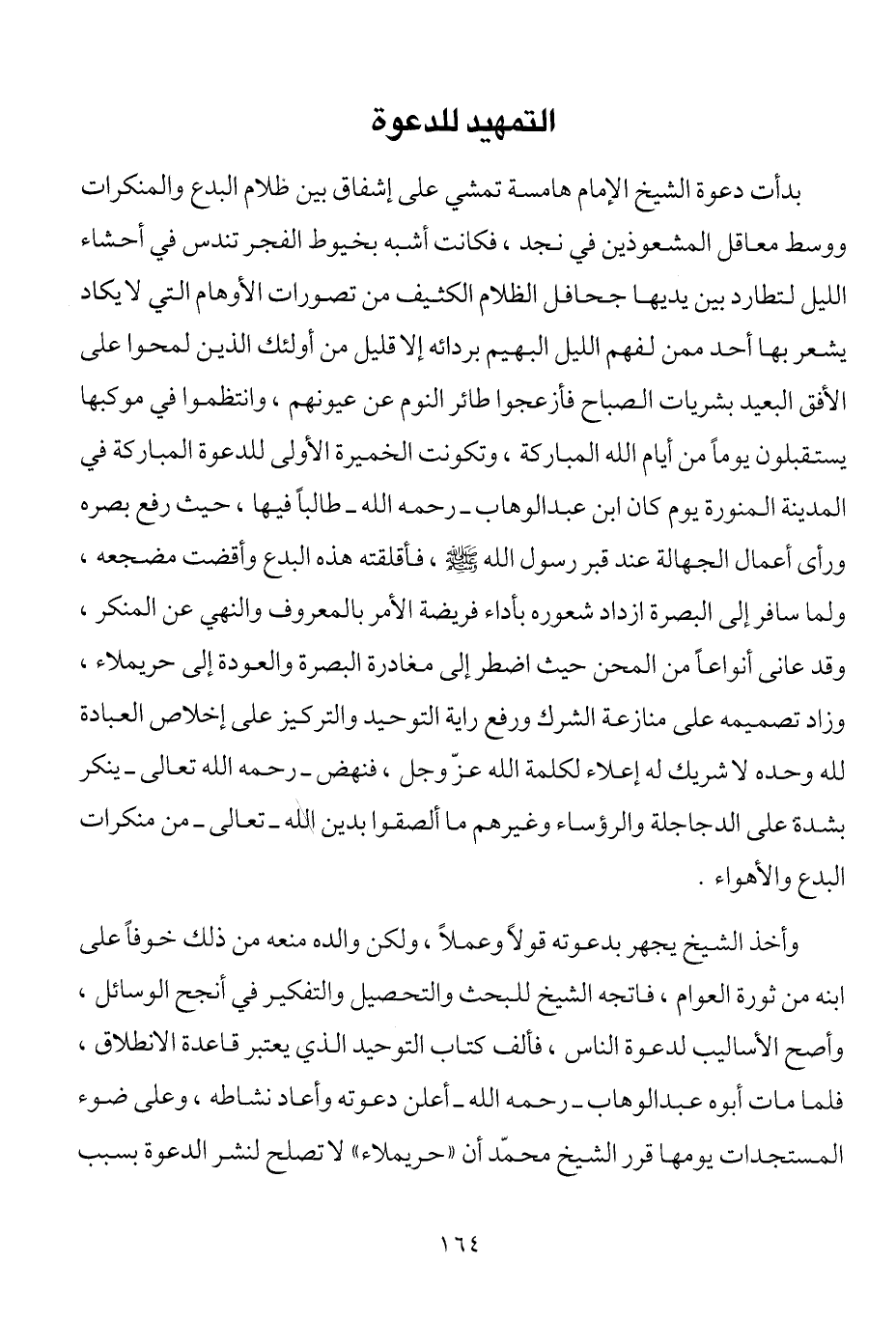 بدأت دعوة الشيخ الإمام هامسة تمشي على إشفاق بين ظلام البدع والمنكرات ووسط معاقل المشعوذين في نجد، فكانت أشبه بخيوط الفجر تندس في أحشاء الليل لتطارد بين يديها جحافل الظلام الكثيف من تصورات الأوهام التي لا يكاد يشعر بها أحد ممن لفهم الليل البهيم بردائه إلا قليل من أولئك الذين لمحوا على الأفق البعيد بشريات الصباح، فأزعجوا طائر النوم من عيونهم، وانتظموا في موكبها يستقبلون يوماً من أيام الله المباركة، وتكونت الخميرة الأولى للدعوة المباركة في المدينة المنورة يوم كان ابن عبد الوهاب رحمه الله طالباً فيها، حيث رفع بصره ورأى أعمال الجهالة عند قبر رسول الله صلى الله عليه وسلم، فاقلقته هذه البدع وأقضت مضجعه، ولما سافر إلى البصرة ازداد شعوره بأداء فريضة الأمر بالمعروف والنهي عن المنكر، وقد عانى أنواعاً من المحن حيث اضطر إلى مغادرة البصرة والعودة إلى حريملاء، وزاد تصميمه على منازعة الشرك ورفع راية التوحيد والتركيز على إخلاص العبادة لله وحده لا شريك له إعلاء لكلمة الله عز وجل، فنهض رحمه الله تعالى ينكر بشدة على الدجاجلة والرؤساء وغيرهم ما ألصقوا بدين الله تعالى من منكرات البدع والأهواء.