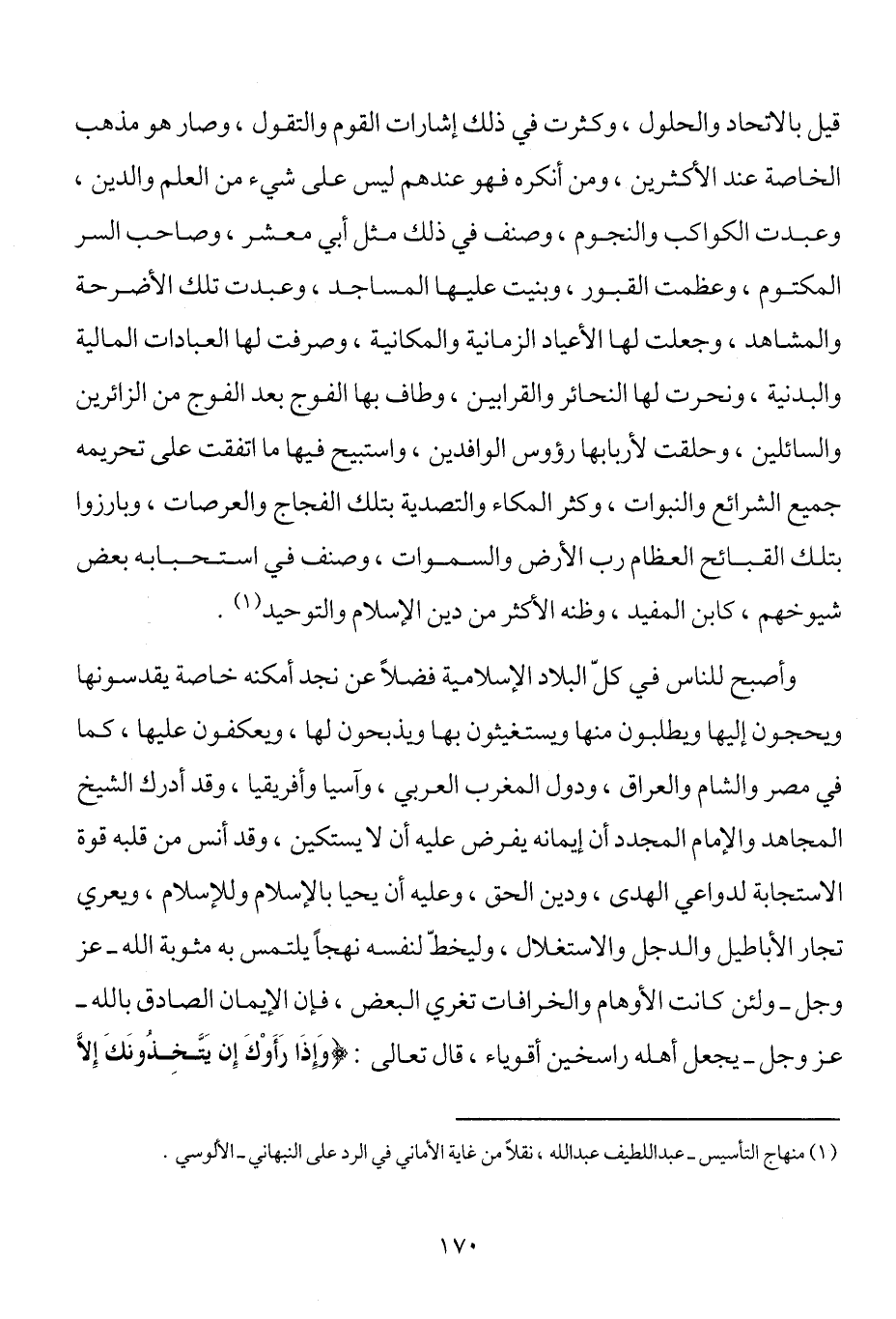وأصبح الناس في كل البلاد الإسلامية فضلاً عن نجد أمكنه خاصة يقدسونها ويحجون إليها، ويطلبون منها ويستغيثون بها ويذبحون لها، ويعكفون عليها، كما في مصر والشام والعراق، ودول المغرب العربي، وآسيا وأفريقيا، وقد أدرك الشيخ المجاهد والإمام المجدد أن إيمانه يفرض عليه أن لا يستكين، وقد أنس من قلبه قوة الاستجابة لدواعي الهدى، ودين الحق، وعليه أن يحيا بالإسلام وللإسلام، ويعري تجار الأباطيل والدجل والاستغلال، وليخط لنفسه نهجاً يلتمس به مثوبة الله عز وجل، ولئن كانت الأوهام والخرافات تغري البعض، فإن الإيمان الصادق بالله عز وجل يجعل أهله راسخين أقوياء، قال تعالى: {وَإِذَا رَأَوْكَ إِنْ يَتَّخِذُونَكَ إِلَّا