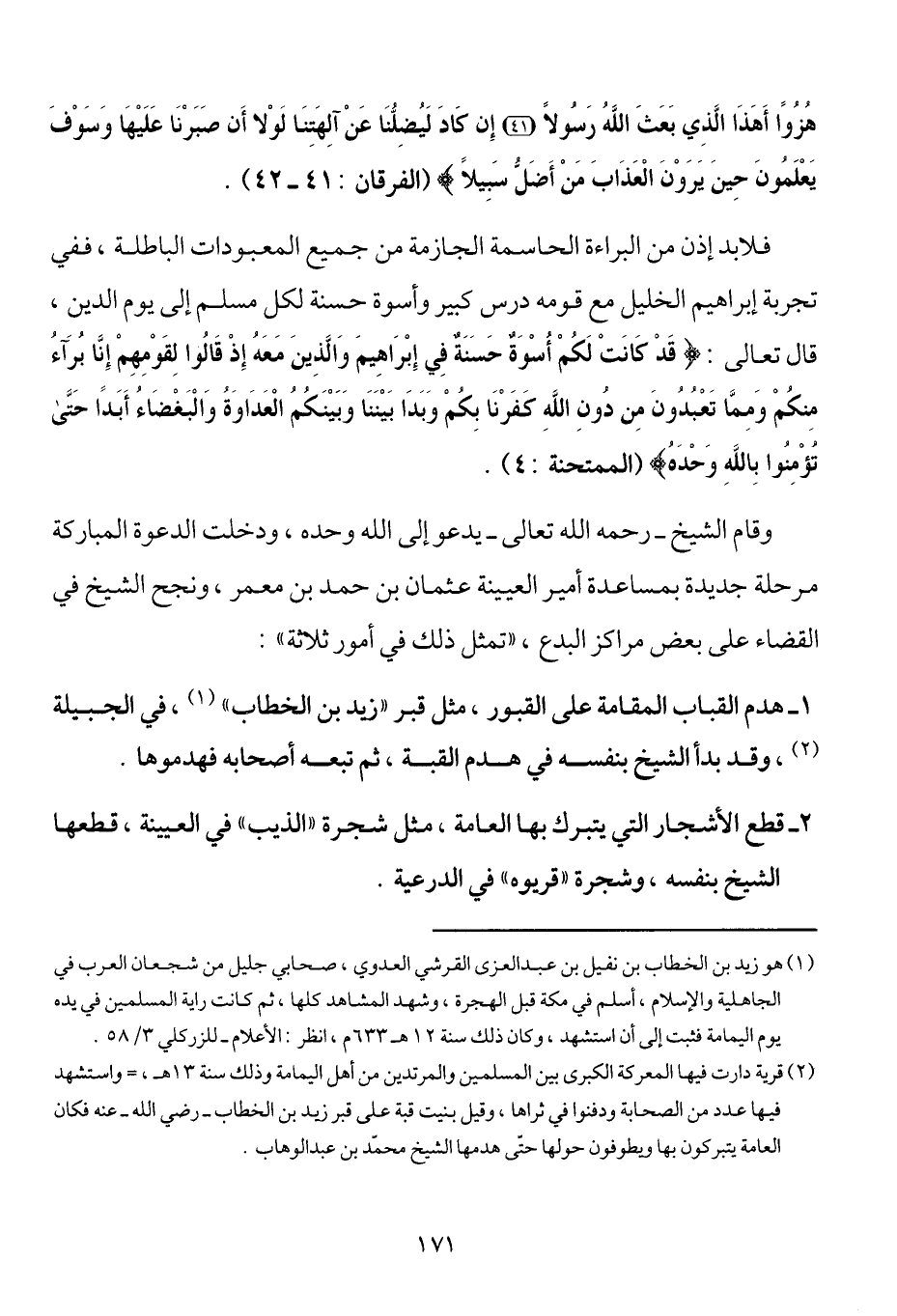 وقام الشيخ رحمه الله تعالى يدعوا إلى الله وحده، ودخلت الدعوة المباركة مرحلة جديدة بمساعدة أمير العيينة عثمان بن حمد بن معمر، ونجح الشيخ في القضاء على بعض مراكز البدع، "تمثل ذلك في أمور ثلاثة":