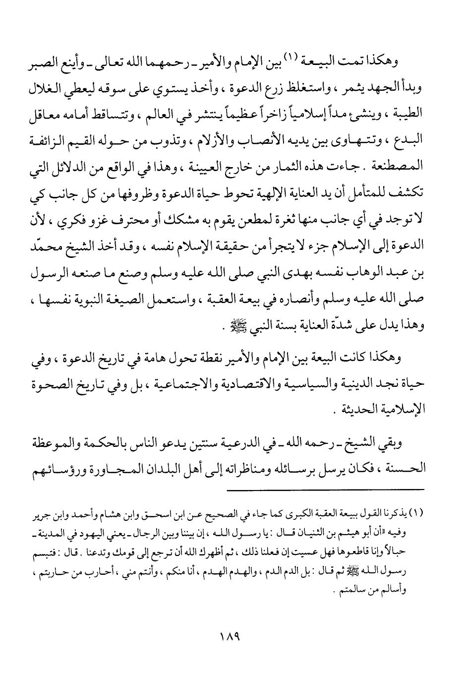وهكذا تمت البيعة1 بين الإمام والأمير رحمهما الله تعالى، وأينع الصبر وبدأ الجهد يثمر، واستغلظ زرع الدعوة، وأخذ يستوي على سوقه ليعطي الغلال الطيبة، ويبنشئ مداً إسلامياً زاخراً عظيماً ينتشر في العالم، وتتساقط أمامه معاقل البدع، وتتهاوى بين يديه الأنصاب والأزلام، وتذوب من حوله القيم الزائفة المصطنعة. جاءت هذه الثمار من خارج العيينة، وهذا في الواقع من الدلائل التي تكشف للمتأمل أن يد العناية الإلهية تحوط حياة الدعوة وظروفها من كل جانب، كي لا توجد في أي جانب منها ثغرة لمطعن يقوم به مشكك أو محترف غزو فكري، لأن الدعوة إلى الإسلام جزء لا يتجزأ من حقيقة الإسلام نفسه، وقد أخذ الشيخ محمد بن عبد الوهاب نفسه بهدى النبي صلى الله عليه وسلم وصنع ما صنعه الرسول صلى الله عليه وسلم وأنصاره في بيعة العقبة، واستعمل الصيغة النبوية نفسها، وهذا يدل على شدة العناية بسنة النبي صلى الله عليه وسلم.