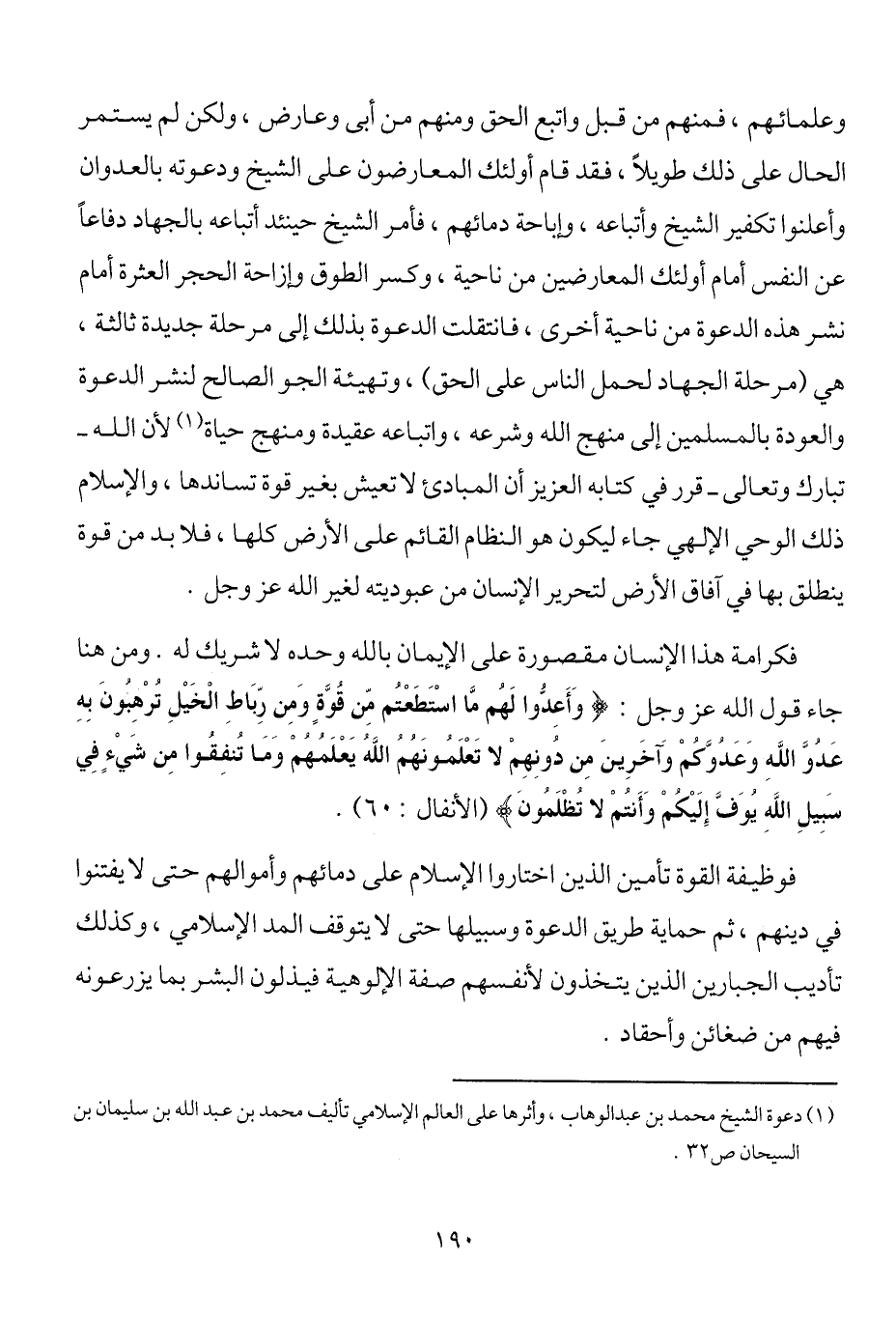 وعلمائهم، فمنهم من قبل واتبع الحق، ومنهم من أبى وعارض، ولكن لم يستمر الحال على ذلك طويلاً، فقد قام أولئك المعارضون على الشيخ ودعوته بالعدوان، وأعلنوا تكفير الشيخ وأتباعه، وإباحة دمائهم، فأمر الشيخ حينئذ أتباعه بالجهاد دفاعاً عن النفس أمام أولئك المعارضين من ناحية، وكسر الطوق وإزاحة الحجر العثرة أمام نشر هذه الدعوة من ناحية أخرى، فانتقلت الدعوة بذلك إلى مرحلة جديدة ثالثة، هي (مرحلة الجهاد لحمل الناس على الحق) ، وتهيئة الجو الصالح لنشر الدعوة والعودة بالمسلمين إلى منهج الله وشرعه، واتباعه عقيدة ومنهج حياة1 لأن الله تبارك وتعالى قرر في كتابه العزيز أن المبادئ لا تعيش بغير قوة تساندها، والإسلام ذلك الوحي الإلهي جاء ليكون هو النظام القائم على الأرض كلها، فلا بد من قوة ينطلق بها في آفاق الأرض لتحرير الإنسان من عبوديته لغير الله عز وجل.