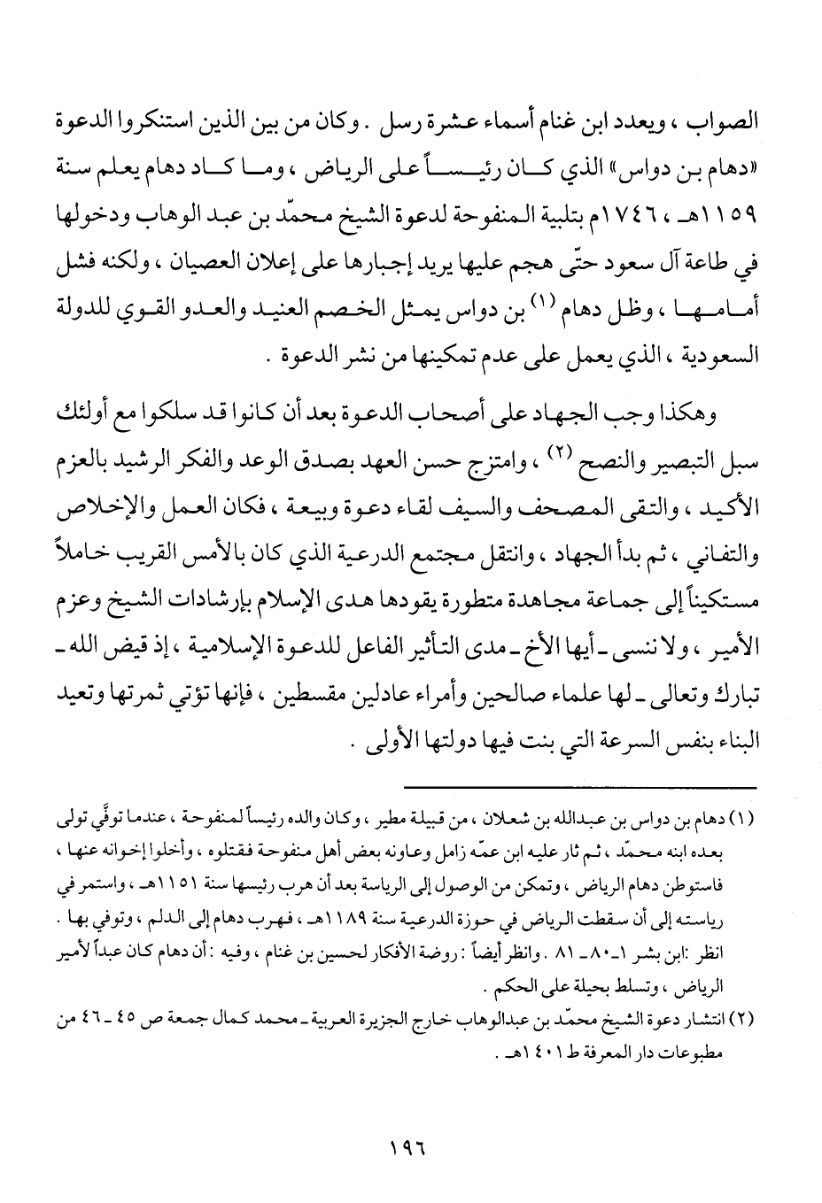 الصواب، ويعدد ابن غنام أسماء عشرة رسل. وكان من بين الذين استنكروا الدعوة "دهام بن دواس" الذي كان رئيساً على الرياض، وما كاد دهام يعلم سنة 1159هـ،1746م بتلبية المنفوحة لدعوة الشيخ محمد بن عبد الوهاب ودخولها في طاعة آل سعود حتى هجم عليها يريد إجبارها على إعلان العصيان، ولكنه فشل أمامها، وظل دهام1 بن دواس يمثل الخصم العنيد العدو القوي للدولة السعودية، الذي يعمل على عدم تمكينها من نشر الدعوة.
