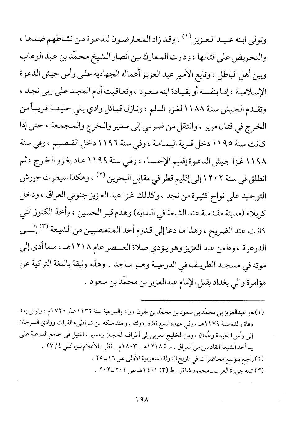 وتولى ابنه عبد العزيز1، وقد زاد المعارضون للدعوة من نشاطهم ضدها، والتحريض على قتالها، ودارت المعارك بين أنصار الشيخ محمد بن عبد الوهاب وبين أهل الباطل، وتابع الأمير عبد العزيز أعماله الجهادية على رأس جيش الدعوة الإسلامية، إما بنفسه أو بقايدة ابنه سعود، وتعاقبت أيام المجد على ربى نجد، وتقدم الجيش سنة 1188 لغزو الدلم، ونازل قبائل وادي بني حنيفة قريباً من الخرج في قتال مرير، وانتقل من ضرمي إلى سدير والخرج والمجمعة، حتى إذا كانت سنة 1195 دخل قرية اليمامة، وفي سنة 1196 دخل القصيم، وفي سنة 1198 غزا جيش الدعوة إقليم الإحساء، وفي سنة 1199 عاد يغزو الخرج، ثم انطلق في سنة 1202 إلى إقليم قطر في مقابل البحرين2، وهكذا سيطرت جيوش التوحيد على نواح كثيرة من نجد، وكذلك عزا عبد العزيز جنوبي العراق، ودخل كربلاء (مدينة مقدسة عند الشيعة في البداية) وهدم قبر الحسين، وأخذ الكنور التي كانت عند الضريح، وهذا ما دعا إلى قدوم أحد المتعصبين من الشيعة3 إلى الدرعية، وطعن عبد العزيز وهو يؤدي صلاة العصر عام 1218هـ، مما أدى إلى موته في مسجد الطريف في الدرعية وهو ساجد، وهذه وثيقة باللغة التركية عن مؤامرة والي بغداد بقتل الإمام عبد العزيز بن محمد بن سعود.