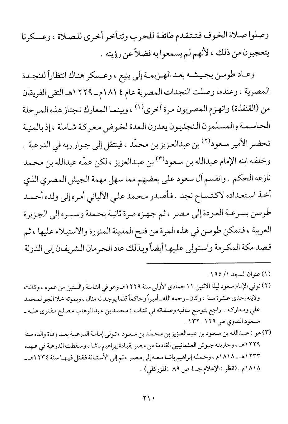 3 هو: عبد الله بن سعود بن عبد العزيز بن محمد بن سعود، تولى إمامة الدرعية بعد وفاة والده سنة 1229هـ، وحاربته جيوش العثمانيين القادمة من مصر بقيادة إبراهيم باشا، وسقطت الدرعية في عهده 1233هـ-1818م، وحمله إبراهيم باشا معه إلى مصر، ثم إلى الأستانة فقتل فيها سنة 1234هـ-1818م. (انظر: الإعلام جـ4 ص 89: للزركلي) .