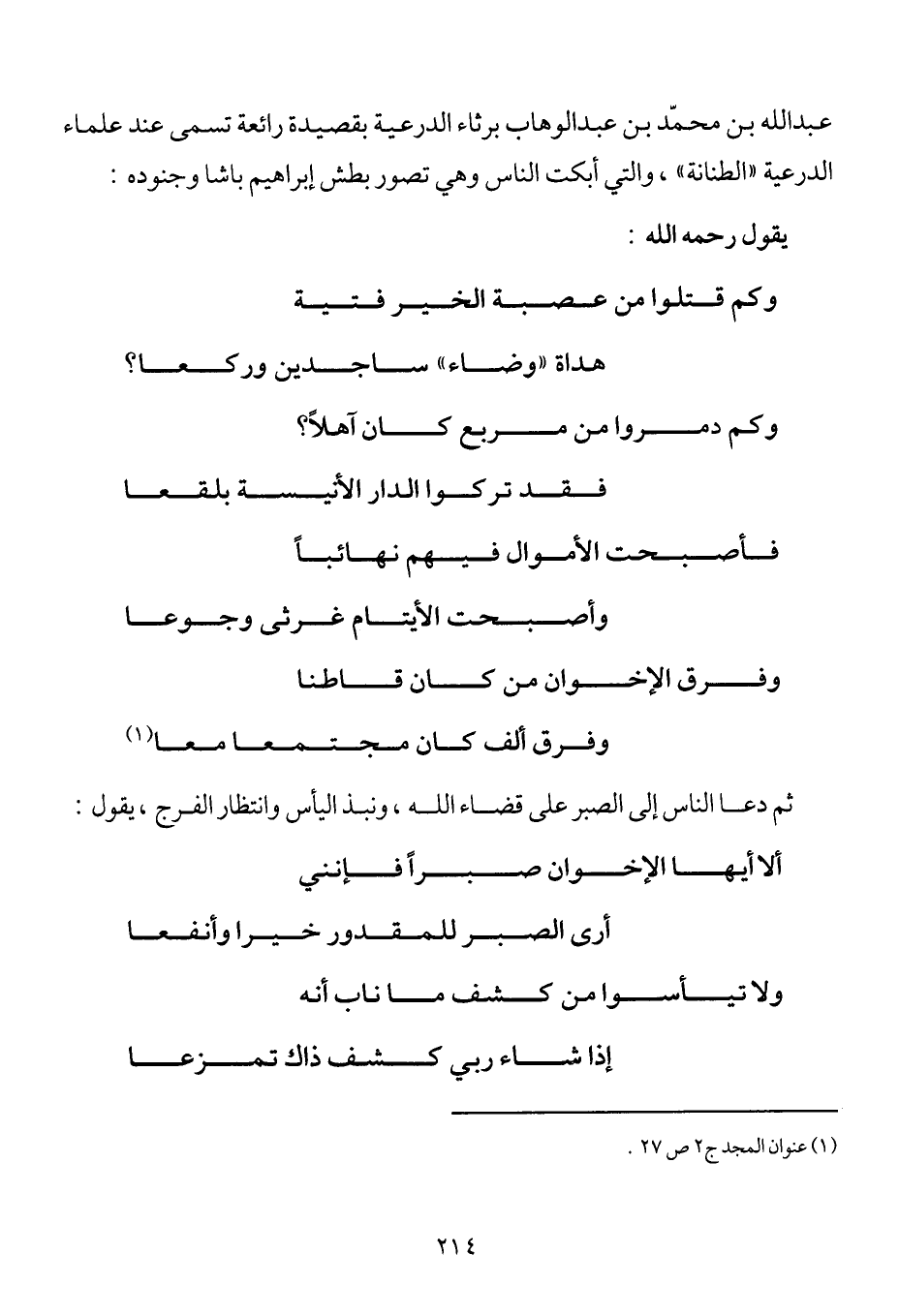 عبد الله بن محمد بن عبد الوهاب برثاء الدرعية بقصيدة رائعة تسمى عند علماء الدرعية "الطنانة"، والتي أبكت الناس وهي تصور بطش إبراهيم باشا وجنوده: