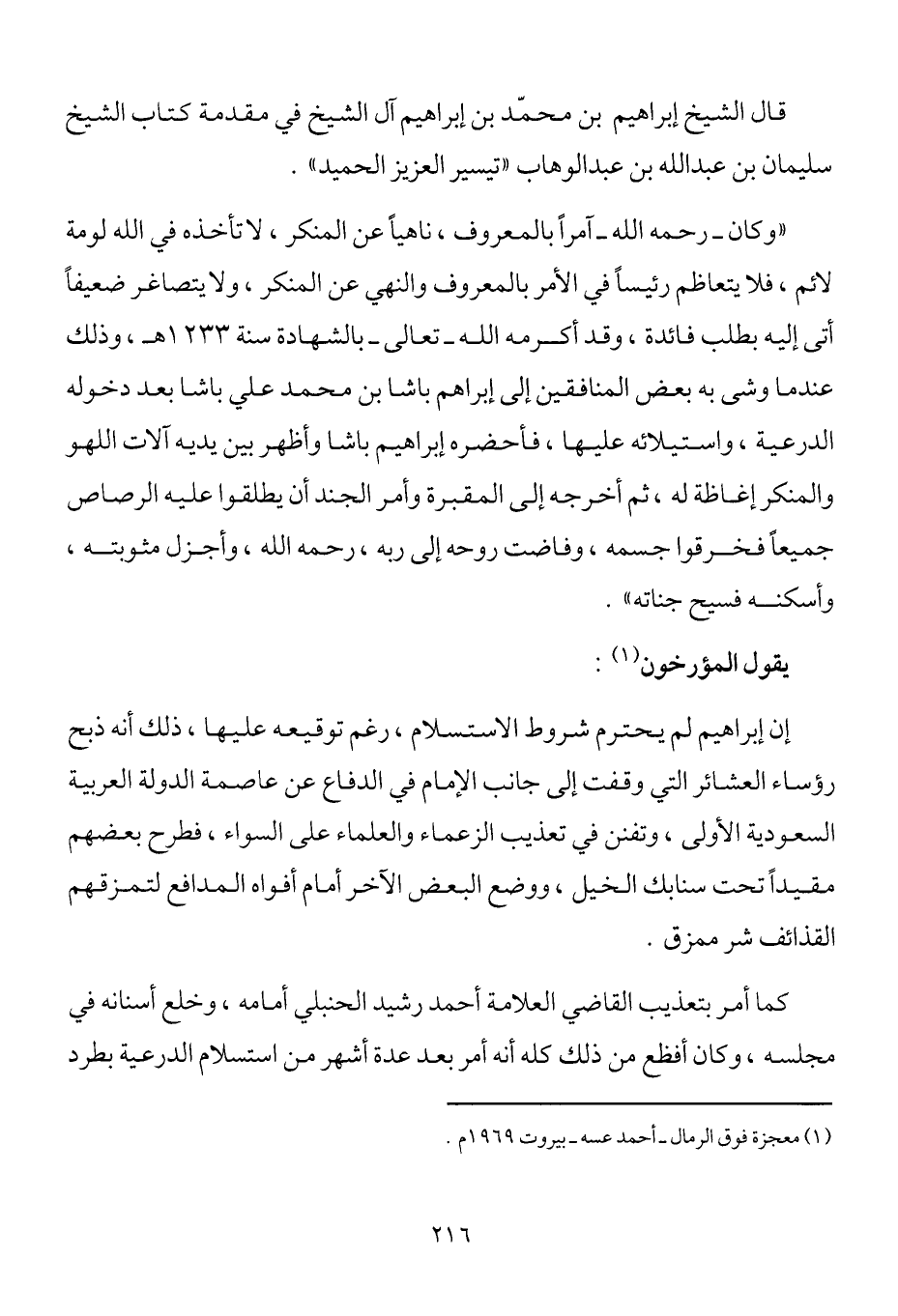 قال الشيخ إبراهيم محمد بن إبراهيم آل الشيخ في مقدمة كتاب الشيخ سليمان بن عبد الله بن عبد الوهاب "تيسير العزيز الحميد".