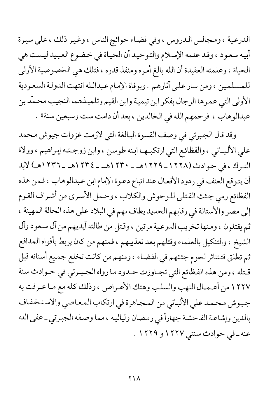 قد قال الجبرتي في وصف القسوة البالغة التي لازمت عزوات جيوش محمد علي الألباني، والفظائع التي ارتكبها ابنه طوسن، وابن زوجته إبراهيم، وولاة الترك، في حوادث (1228-1229هـ-1230هـ-1234هـ-1236هـ) لا بد أن يتوقع العنف في ردود الأفعال عند اتباع دعوة الإمام ابن عبد الوهاب، فمن هذه الفظائع رمي جثث القتلى للوحوش والكلاب، وحمل الأسرى من أشراف القوم إلى مصر والأستانة في رقابهم الحديد، يطاف بهم في البلاد على هذه الحالة المهينة، ثم يقتلون، ومنها تخريب الدرعية مرتين، وقتل من طالته أيديهم من آل سعود وآل الشيخ، والتنكيل بالعلماء وقتلهم بعد تعذيبهم، فمنهم من كان يربط بأفواه المدافع ثم تطلق فتتناثر لحوم جثثهم في الفضاء، ومنهم من كانت تخلع جميع أسنانه قبل قتله، ومن هذه الفظائع التي تجاوزت حدود ما رواه الجبرتي في حوادث سنة 1227 من أعمال النهب والسلب وهتك الأعراض، وذلك كله مع ما عرفت به جيوش محمد علي الألباني من المجاهرة في ارتكاب المعاصي والاستخفاف بالدين وإشاعة الفاحشة جهاراً في رمضان ولياليه، مما وصفه الجبرتي عفى الله عنه في حوادث سنتي 1227و1229.