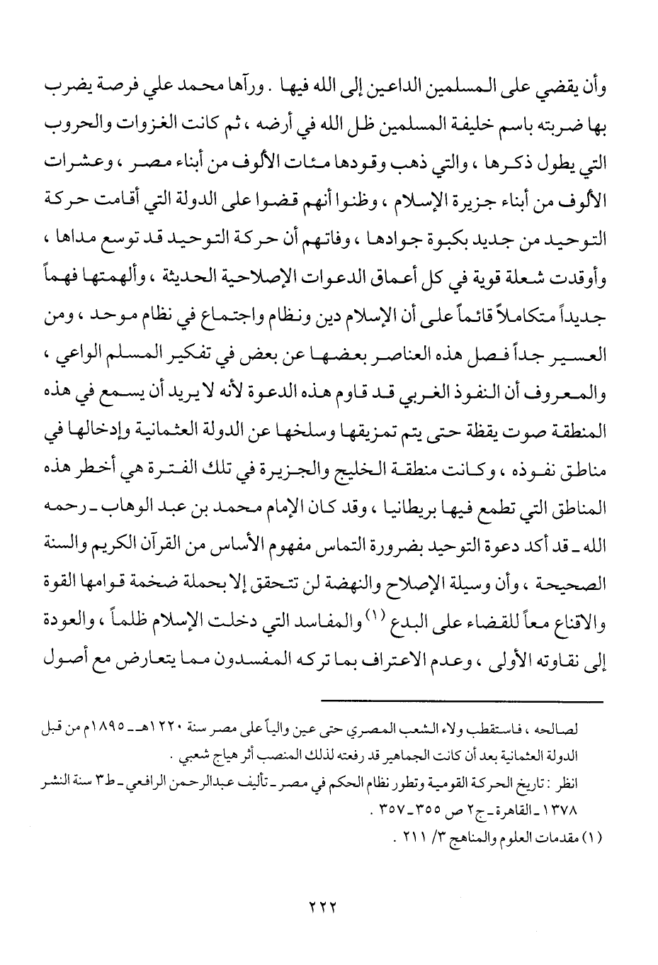 وأن يقضي على المسلمين الداعين إلى الله فيها. ورآها محمد علي فرصة يضرب بها ضربته باسم خليفة المسلمين ظل الله في أرضه، ثم كانت الغزوات والحروب التي يطول ذكرها، والتي ذهب وقودها مئات الألوف من أبناء مصر، وعشرات الأولوف من أبناء جزيرة الإسلام، وظنوا أنهم قضوا على الدولة التي أقامت حركة التوحيد من جديد بكبوة جوادها، وفاتهم أن حركة التوحيد قد توسع مداها، وأوقدت شعلة قوية في كل أعماق الدعوات الإصلاحية الحديثة، وألهمتها فهماً جديداً متكاملاً قائماً على أن الإسلام دين ونظام واجتماع في نظام موحد، ومن العسير جداً فصل هذه العناصر بعضها عن بعض في تفكير المسلم الواعي، والمعروف أن النفوذ الغربي قد قاوم هذه الدعوة لأنه لا يريد أن يسمع في هذه المنطقة صوت يقظة حتى يتم تمزيقها وسلخها عن الدولة العثمانية وإدخالها في مناطق نفوذه، وكانت منطقة الخليج والجزيرة في تلك الفترة هي أخطر هذه المناطق التي تطمع فيها بريطانيا، وقد كان الإمام محمد بن عبد الوهاب رحمه الله قد أكد دعوة التوحيد بضرورة التماس مفهوم الأساس من القرآن الكريم والسنة الصحيحة، وأن وسيلة الإصلاح والنهضة لن تتحقق إلا بحملة ضخمة قوامها القوة والإقناع معاً للقضاء على البدع1 والمفاسد التي دخلت الإسلام ظلماً، والعودة إلى نقاوته الأولى، وعدم الاعتراف بما تركه المفسدون مما يتعارض مع أصول