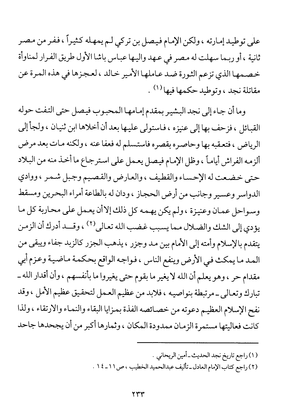 فما كان من الإمام فيصل إلا أن يعرض على القائد المصري استعداده للتسليم إليه على شرط إعطائه الأمان لكل من كان يحارب معه، فقبل القائد المصري ذلك، وبادر الإمام فيصل بتسليم نفسه إليه في اليوم الثالث والعشرين من شهر رمضان سنة 1255هـ- (1838م) ، فبعث به إلى مصر مع أخيه جلوي بن تركي وابنى أخيه عبد الله ومحمد، وأجلس خالدا على كرسي الحكم، وسلمه مقاليد الإمارة في نجد ليوجه الشعب إلى غير الاتجاه الذي كان عليه، ويسير به على النظم والتعاليم العصرية المتبعة في مصر، فقام خالد بما عهد إليه به، فنفر منه الناس، وأنكروا عليه أعماله، وقامت الثورات ضده، حتى توحدت القرى النجدية بزعامة عبد الله بن ثنيان بن إبراهيم بن ثنيان بن سعود1، تريد التحرر من حكم الأتراك والمصريين، وتبغي المحافظة على الدين الإسلامي الصحيح على طريقة الإمام المجدد محمد بن عبد الوهاب رحمه الله، وقررت خلع الأمير المذكور، فما وسعه إلا أن ينجو بنفسه، ففر إلى الإحساء فالقطيف ثم الكويت، ومنها إلى الحجاز حيث مات بها في عام 1257هـ (1861م) ، وخلا الجو لعبد الله بن ثنيان فاستبد بالحكم وعمل على وضع الضرائب الباهظة على الشعب ليستعين بذلك