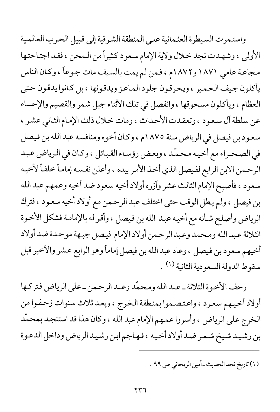 تستعر في جميع الأنحاء، حتى تدخل في شؤونها الخاصة أمير حائل محمد بن الرشيد1، وشجع الفتنة للتخلص من نفوذ آل سعود، ومن الضريبة السنوية، كما شجعها الأتراك لاستعادة السيطرة على الإحساء، وتم استيلاء سعود على الإحساء، وساعده شيخ البحرين وسلطان مسقط، وقبائل بني خالد، والعجمان، وبني مرة، وبات الطريق مفتوحاً إلى الرياض، فدخلها سعود بن فيصل سنة 1288هـ (1871م) عندما أرسل عبد الله رسائل إلى مدحت باشا والي بغداد يطلب مساعدته، فكانت المناسبة المرجوة عند الأتراك لاستعادة الإحساء، فجهز مدحت باشا حملة من خمسة آلاف جندي، واستعان بناصر السعدون شيخ قبائل المنتفق، وبعبد الله الصباح شيخ الكويت، وأن سعوداً ثائر ضد الدولة العثمانية، وأنه يتعاون مع الإنكليز، وتطورت الأمور وزادت المحن، واتجهت الحملة من البصرة عام 1871م، وساعدتها الكويت بالمال والرجال فسارت بحراً إلى القصير، وبراً إلى القطيف، ثم احتل الإحساء وقطر فقطع مدحت باشا بذلك الصلة بين نجد وعمان، وأصدر مدحت باشا منشوراً على السلطان جاء فيه: