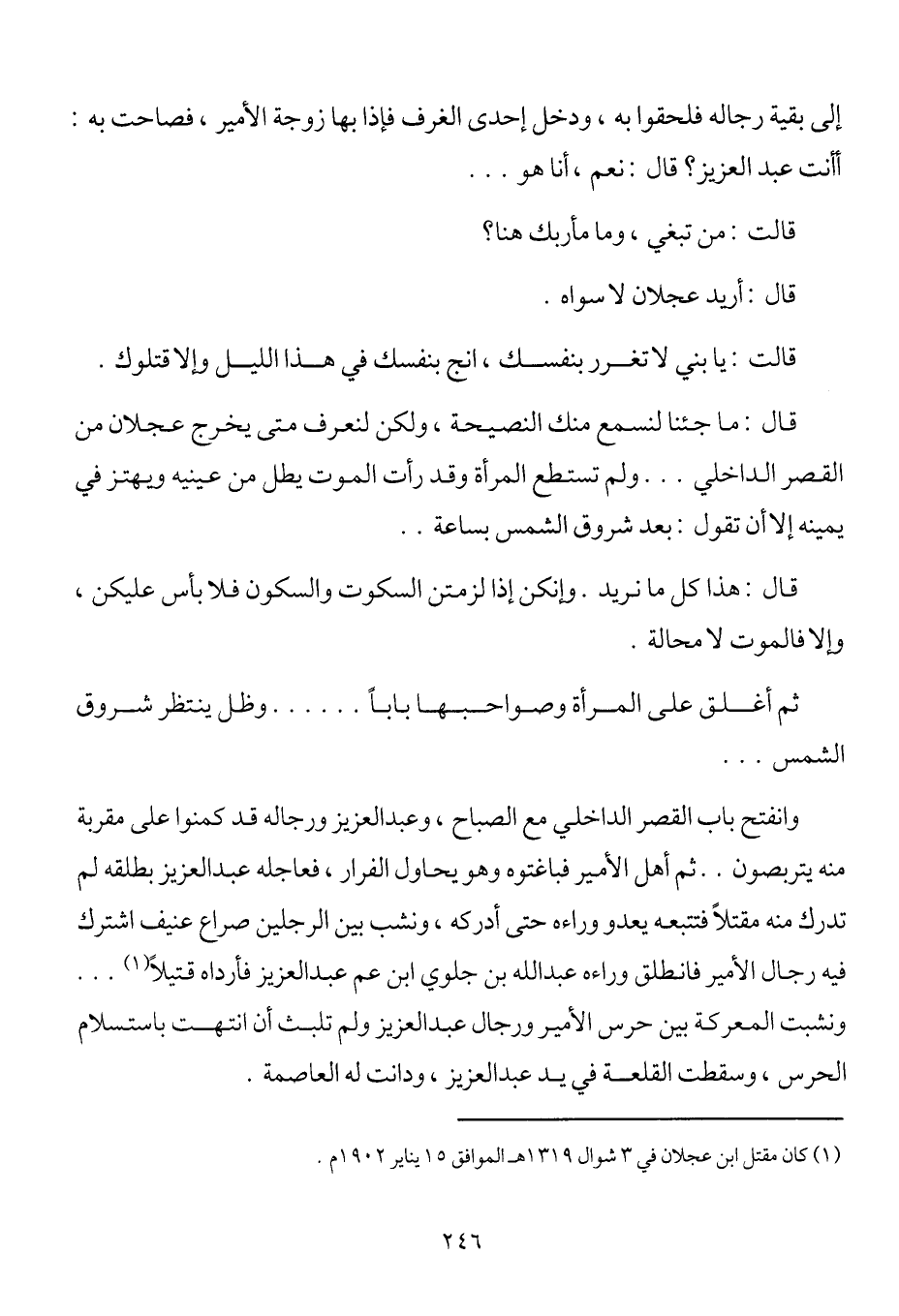 إلى بقية رجاله فلحقوا به، ودخل إحدى الغرف فإذا بها زوجة الأمير، فصاحت به: أأنت عبد العزيز؟ قال: نعم، أنا هو....