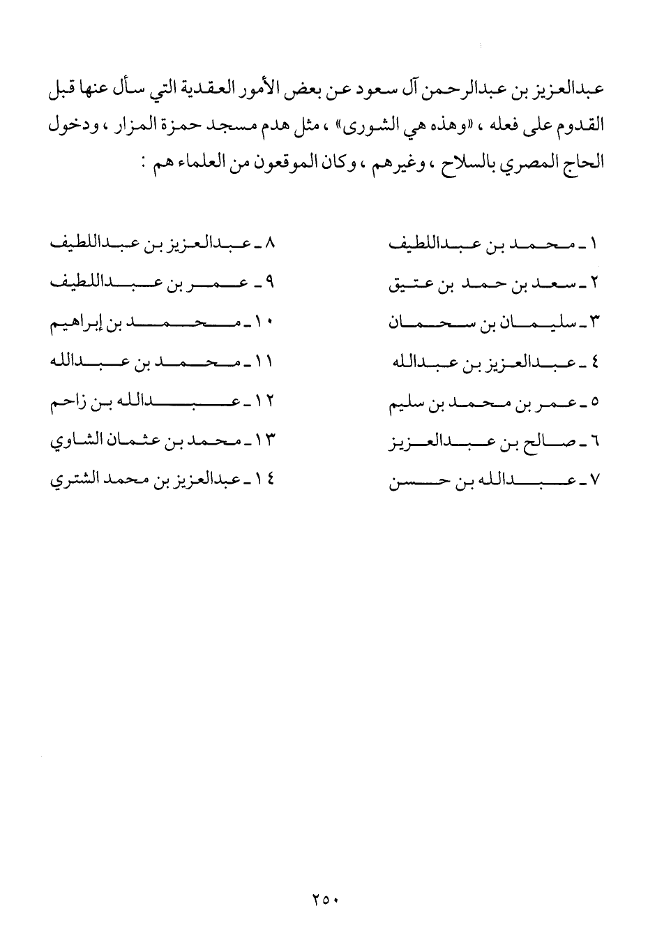 عبد العزيز بن عبد الرحمن آل سعود عن بعض الأمور العقدية التي سأل عنها قبل القدوم على فعله، "وهذه هي الشورى"، مثل هدم مسجد حمزة المزار، ودخول الحاج المصري بالسلاح، وغيرهم، وكان الموقعون من العلماء هم: