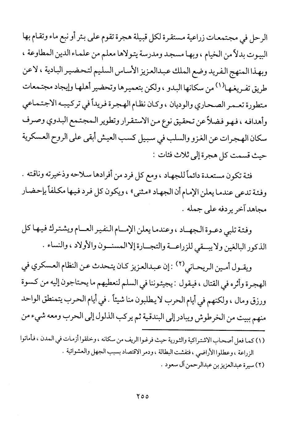 ويقول أمين الريحاني2: إن عبد العزيز كان يتحدث عن النظام العسكري في الهجرة وأثره في القتال: فيقول: يجيئوننا في السلم لنعطيهم ما يحتاجون إليه من كسوة ورزق ومال، ولكنهم في أيام الحرب لا يطلبون منا شيئاً. في أيام الحرب يتمنطق الواحد منهم ببيت من الخرطوش ويبادر إلى البندقية ثم يركب الذلول إلى الحرب ومعه شيء من