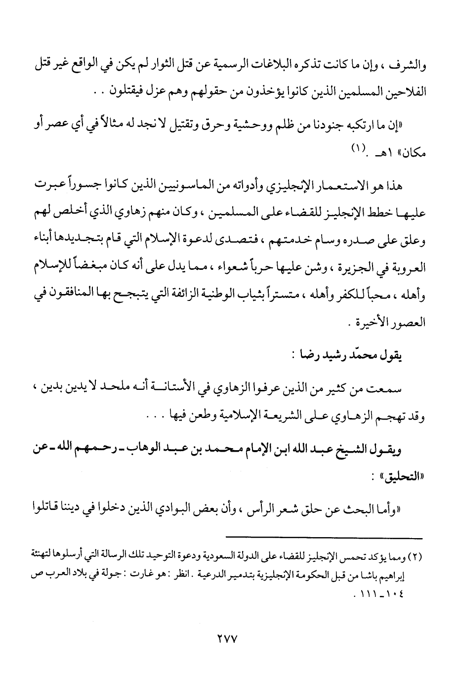 1 ومما يؤكد تحمس الإنجليز للقضاء على الدولة السعودية ودعوة التوحيد تلك الرسالة التي أرسلوها لتهنئة إبراهيم باشا من قبل الحكومة الإنجليزية بتدمير الدرعية. انظر: هو غارت: جولة في بلاد العرب ص 104-111.