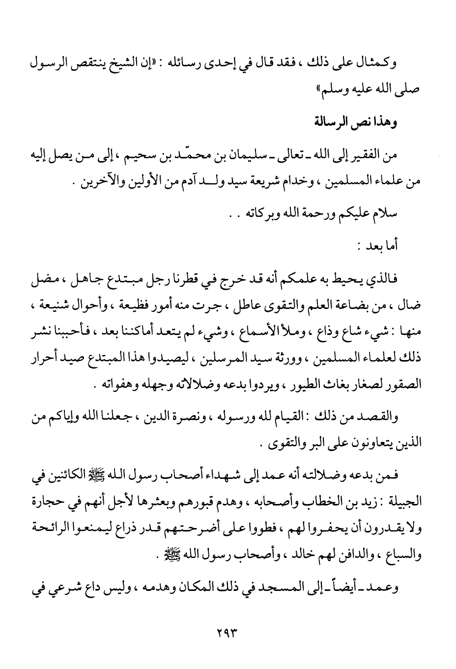 من الفقير إلى الله تعالى سليمان بن محمد بن سحيم، إلى من يصل إليه من علماء المسلمين، وخدام شريعة سيد ولد آدم من الأولين والآخيرن.