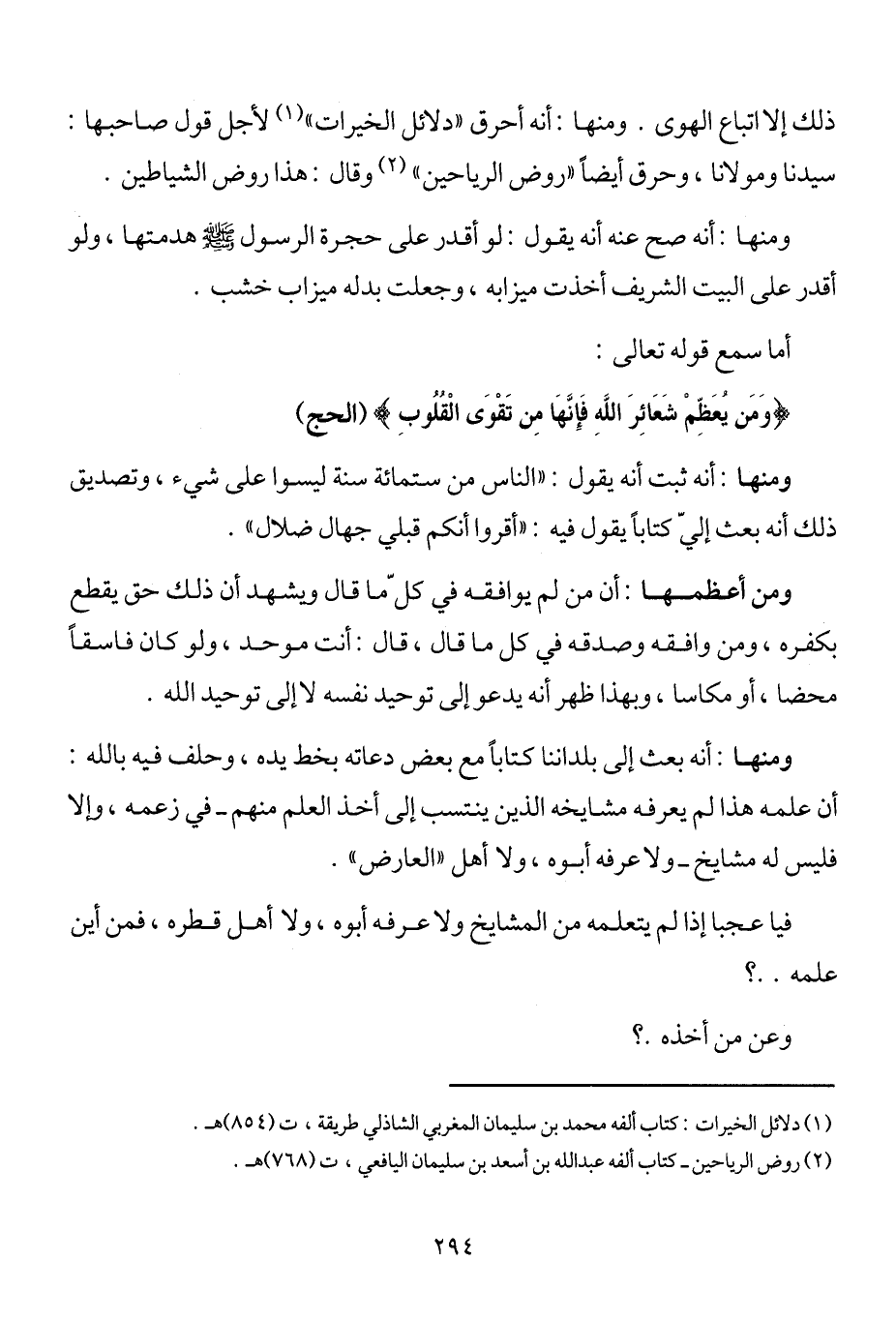 ذلك إلا اتباع الهوى. ومنها: أنه أحرق "دلائل الخيرات"1 لأجل قول صاحبها: سيدنا ومولانا، وحرق أيضاً "روض الرياحين"2، وقال: هذا روض الشياطين.