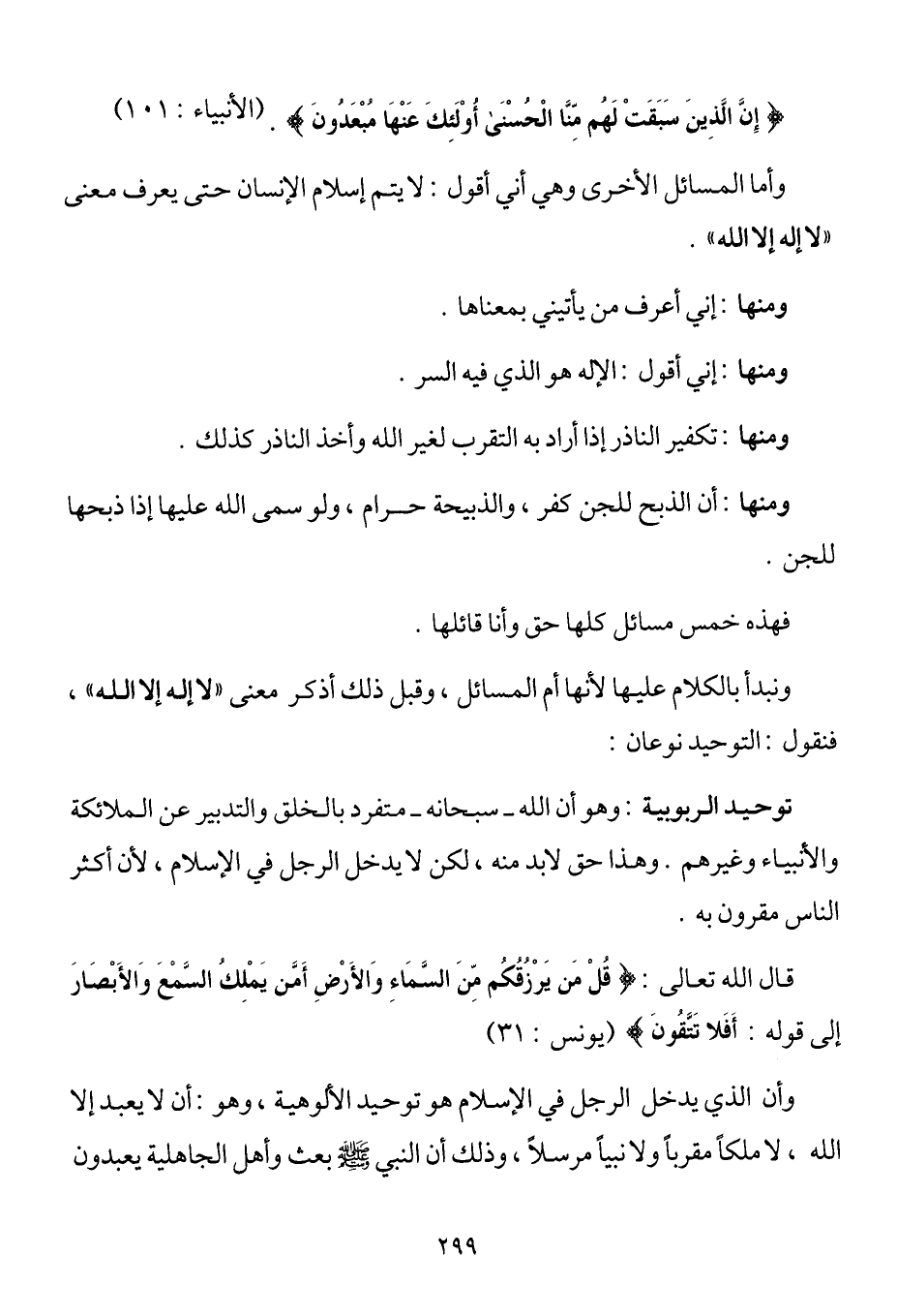 وأن الذي يدخل الرجل في الإسلام هو توحيد الألوهية، وهو: أن لا يعبد إلا الله لا ملكاً مقرباً ولا نبياً مرسلا، وذلك أن النبي صلى الله عليه وسلم بعث وأهل الجاهلية يعبدون