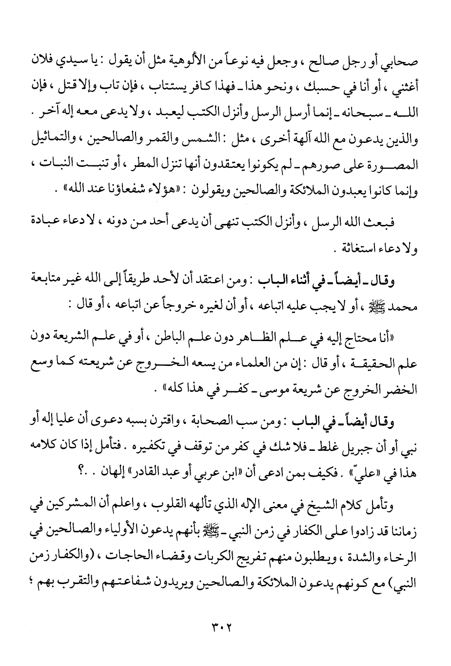 وقال –أيضاً- في الباب: ومن سب الصحابة، واقترن بسبه دعوى أن علياً إله أو نبي أو أن جبريل غلط -فلا شك في كفر من توقف في تكفيره. فتأمل إذا كان كلامه هذا في "علي". فكيف بمن ادعى أن "ابن عربي أو عبد القادر" إلهان؟