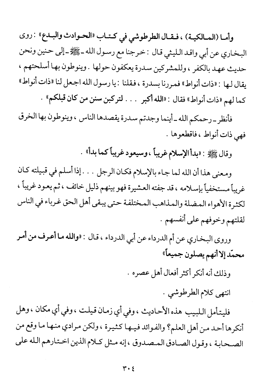 وأما (المالكية) ، فقال الطرطوشي في كتاب "الحوادث والبدع": روى البخاري عن أبي واقد الليثي قال: "خرجنا مع رسول الله صلى الله عليه وسلم إلي حنين ونحن حديث عهد بالكفر، وللمشركين سدرة يعكفون حولها، وينوطون بها أسلحتهم، يقال لها "ذات أنواط" فمررنا بسدرة، فقلنا: يا رسول الله اجعل لنا "ذات أنواط" كما لهم "ذات أنواط" فقال: "الله أكبر ... لتركبن سنن من كان قبلكم".