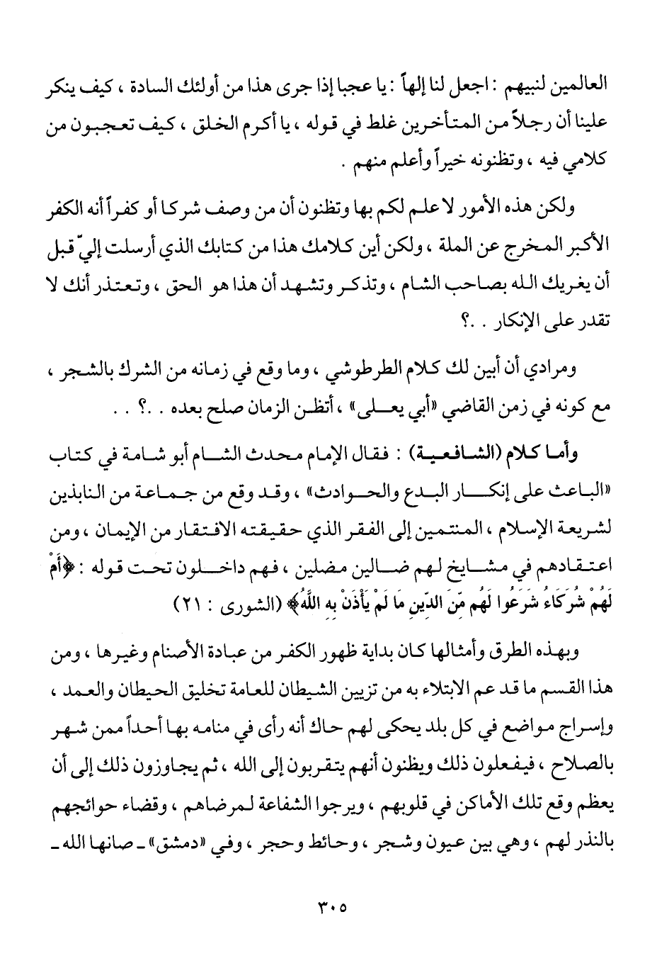 وأما كلام (الشافعية) فقال الإمام محدث الشام أبو شامة في كتاب "الباعث على إنكار البدع والحوادث"، وقد وقع من جماعة من النابذين لشريعة الإسلام المنتمين إلى الفقر الذي حقيقته الافتقار من الإيمان، ومن اعتقادهم في مشايخ لهم ضالين مضلين فهم داخلون تحت قوله: {أَمْ لَهُمْ شُرَكَاءُ شَرَعُوا لَهُمْ مِنَ الدِّينِ مَا لَمْ يَأْذَنْ بِهِ اللَّهُ} (الشورى: 21) .