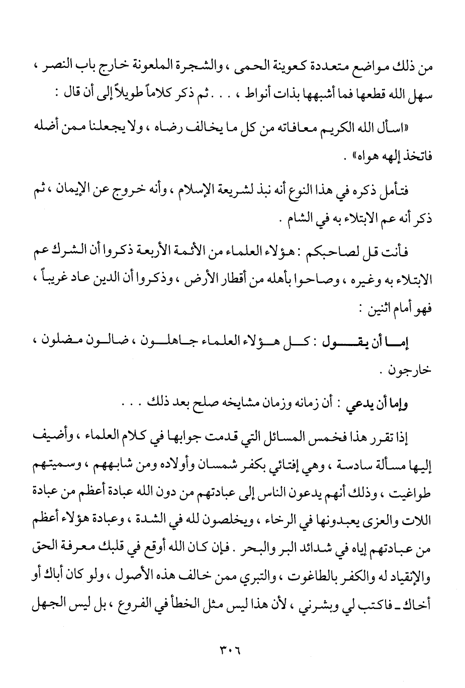 إذا تقرر هذا فخمس المسائل التي قدمت جوابها في كلام العلماء، وأضيف إليها مسألة سادسة، وهى: إفتائي بكفر شمسان وأولاده ومن شابههم، وسميتهم طواغيت، وذلك أنهم يدعون الناس إلى عبادتهم من دون الله عبادة أعظم من عبادة اللات والعزى يعبدونها في الرخاء، ويخلصون لله في الشدة وعبادة هؤلاء أعظم من عبادتهم إياه في شدائد البر والبحر، فإن كان الله أوقع في قلبك معرفة الحق والانقياد له والكفر بالطاغوت والتبري ممن خالف هذه الأصول ولو كان أباك أو أخاك -فاكتب لي وبشرني لأن هذا ليس مثل الخطأ في الفروع، بل ليس الجهل