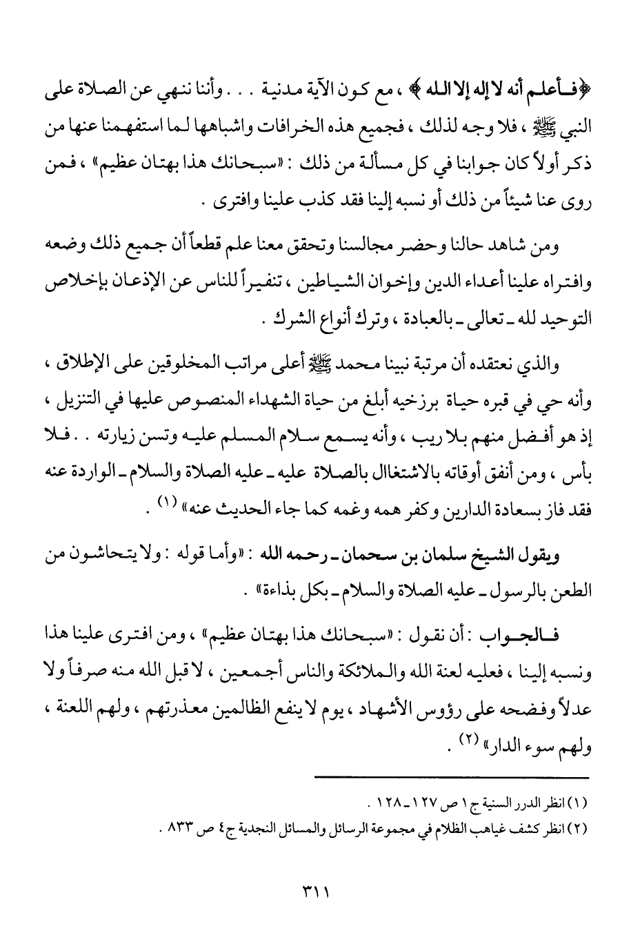 {فَاعْلَمْ أَنَّهُ لا إِلَهَ إِلَّا اللَّهُ} ، مع كون الآية مدنية ... وأننا ننهى عن الصلاة على النبي صلى الله عليه وسلم، فلا وجه لذلك، فجميع هذه الخرافات وأشباهها لما استفهمنا عنها من ذكر أولا كان جوابنا في كل مسألة من ذلك" سبحانك هذا بهتان عظيك"، فمن روى عنا شيئاً من ذلك أو نسبه إلينا فقد كذب علينا وافترى.