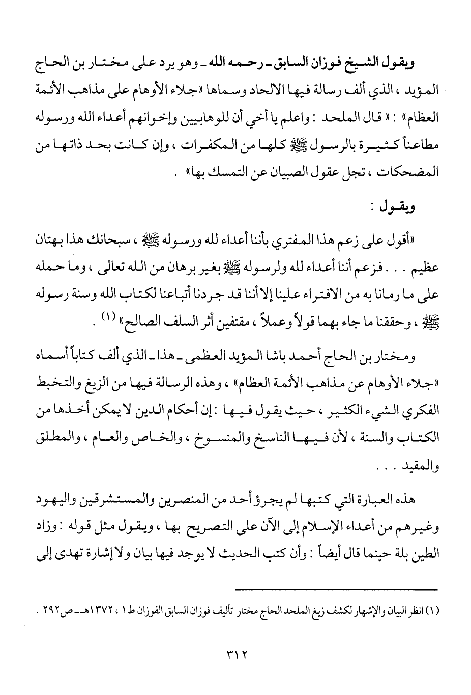 ويقول الشيخ فوزان السابق رحمه الله وهو يرد على مختار بن الحاج المؤيد، الذي ألف رسالة فيها الإلحاد وسماها "جلاء الأوهام على مذاهب الأئمة العظام": " قال الملحد: واعلم يا أخي أن للوهابين وإخوانهم أعداء الله ورسوله مطاعن كثيرة بالرسول صلى الله عليه وسلم كلها من المكفرات، وإن كانت بحد ذاتها من المضحكات، تجل عقول الصبيان عن التمسك بها".