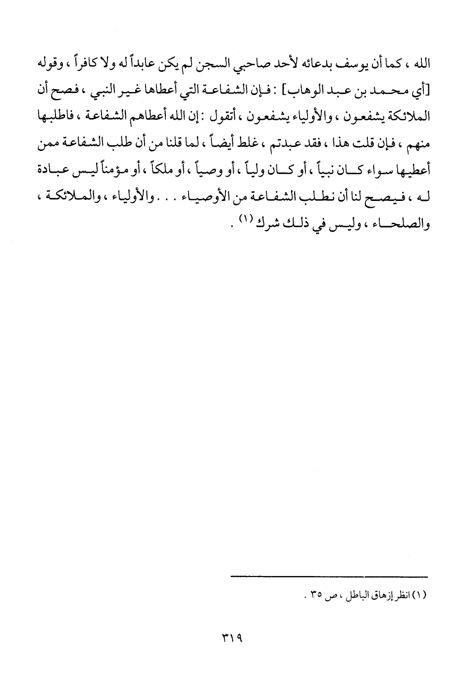 الله، كما أن يوسف بدعائه لأحد صاحبي السجن لم يكن عابداً له ولا كافراً، وقوله [أي محمد بن عبد الوهاب] : فإن الشفاعة التي أعطاها غير النبي، فصح أن الملائكة يشفعون والأولياء يشفعون، أتقول: إن الله أعطاهم الشفاعة، فاطلبها منهم، فإن قلت هذا، فقد عبدتم، غلط أيضاً، لما قلنا من أن طلب الشفاعة ممن أعطيها سواء كان نبياً أو كان ولياً أو وصياً أو ملكاً، أو مؤمناً ليس عبادة له، فيصح لنا أن نطلب الشفاعة من الأوصياء ... والأولياء والملائكة، والصلحاء، وليس في ذلك شرك1.