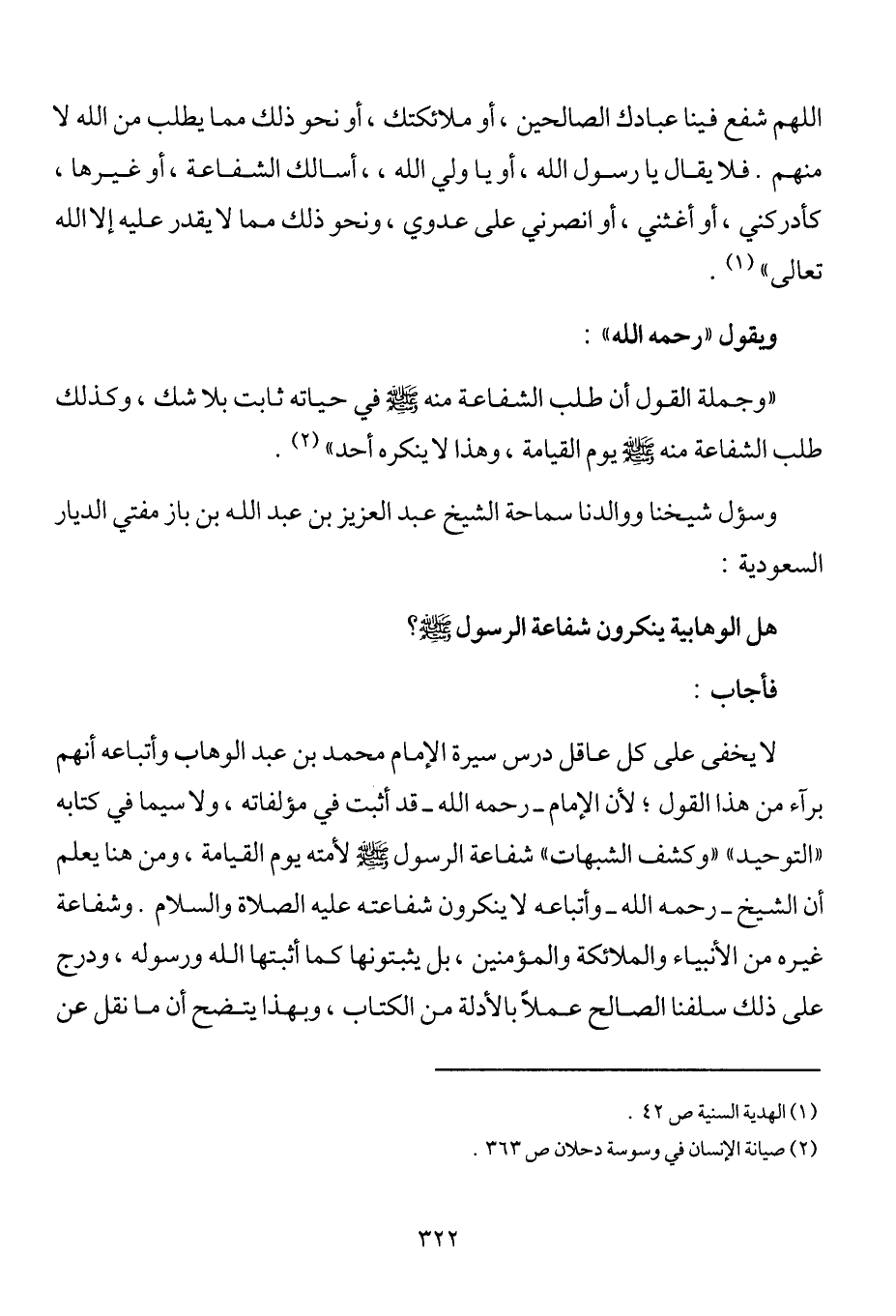 لا يخفى على كل عاقل درس سيرة الإمام محمد بن عبد الوهاب وأتباعه أنهم برآء من هذا القول، لأن الإمام رحمه الله قد أثبت في مؤلفاته، ولا سيما في كتابه "التوحيد" و"كشف الشبهات" شفاعة الرسول صلى الله عليه وسلم لأمته يوم القيامة، ومن هنا يعلم أن الشيخ رحمه الله وأتباعه لا ينكرون شفاعته عليه الصلاة والسلام. وشفاعة غيره من الأنبياء والملائكة والمؤمنين، بل يثبتونها كما أثبتها الله ورسوله، ودرج على ذلك سلفنا الصالح عملاً بالأدلة من الكتاب، وبهذا يتضح أن ما نقل عن